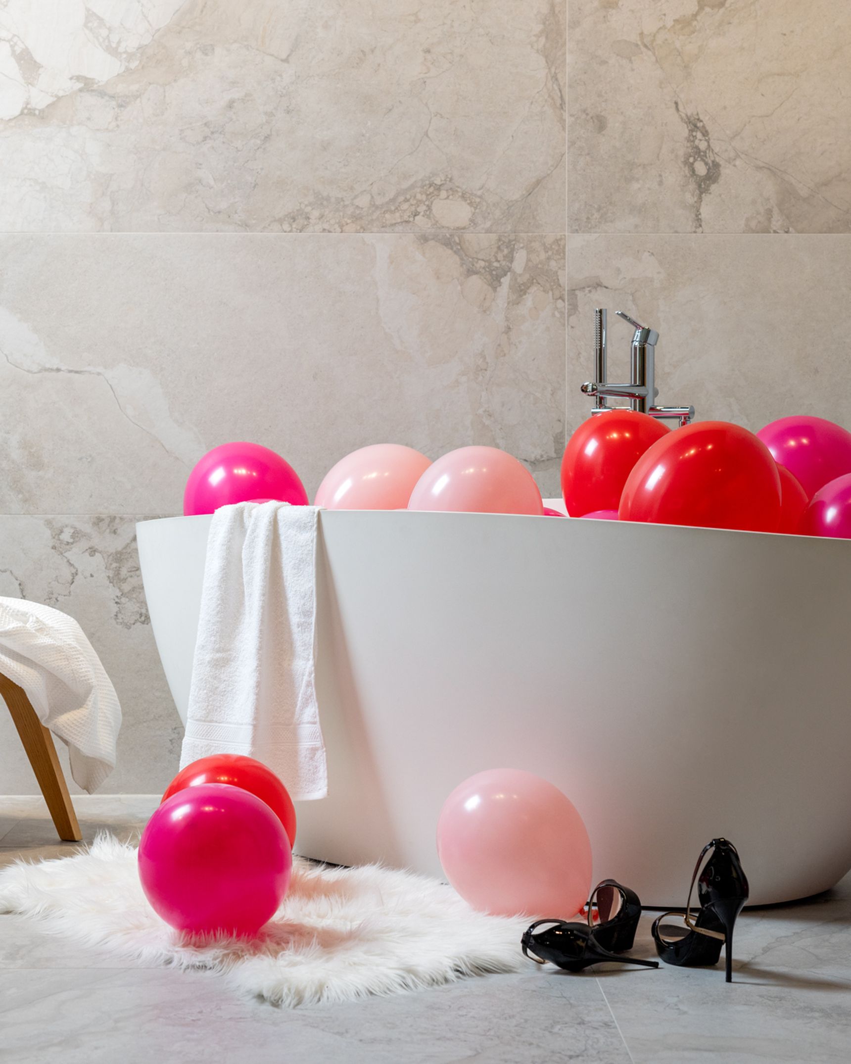Kies grootformaat marmerlooktegels op de wanden voor een elegante, hotel-chique sfeer. Combineer met minimalistisch sanitair en indirecte verlichting voor een luxueuze totaalbeleving.