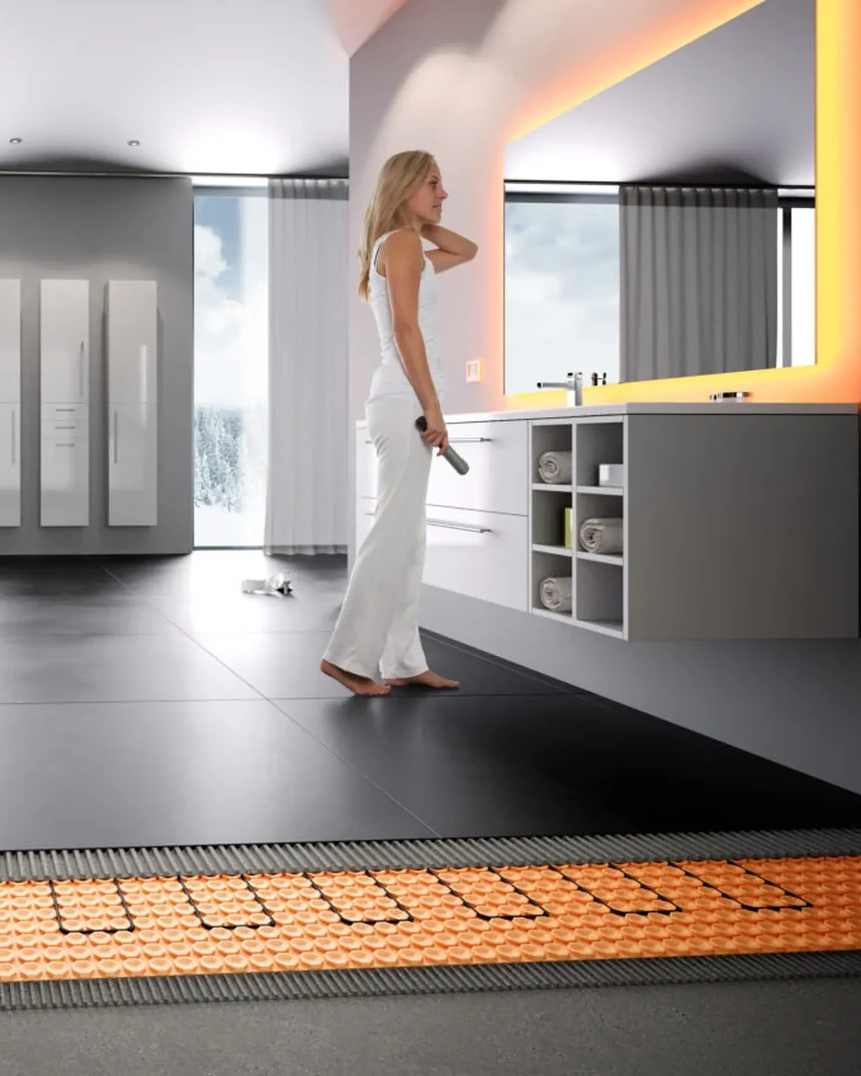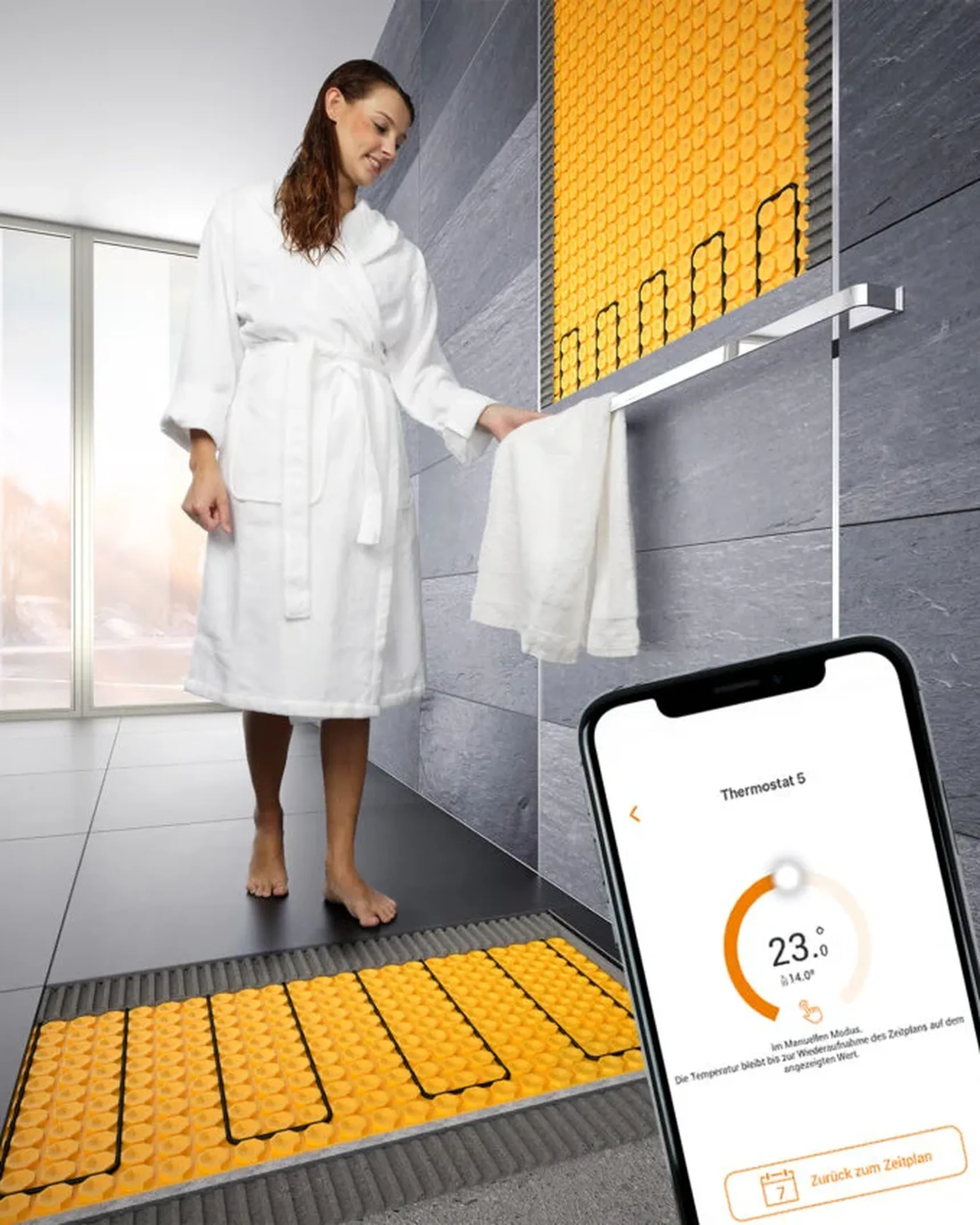 Haat u het ook wanneer uw badkamer pas warm is, wanneer u ze alweer verlaat? Dan biedt onze elektrische vloerverwarming Ditra-Heat de oplossing. Deze slimme technologie werkt met een aparte thermostaat, los van uw centrale verwarming. Zo bepaalt u zelf wanneer en hoe warm het wordt – enkel in de badkamer, precies op het moment dat u dat wilt.