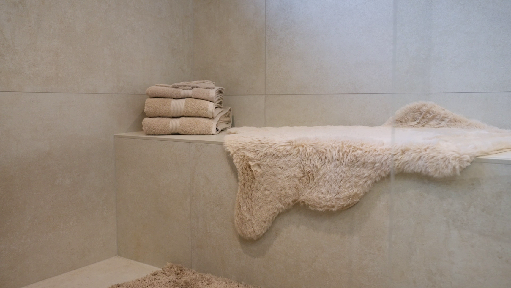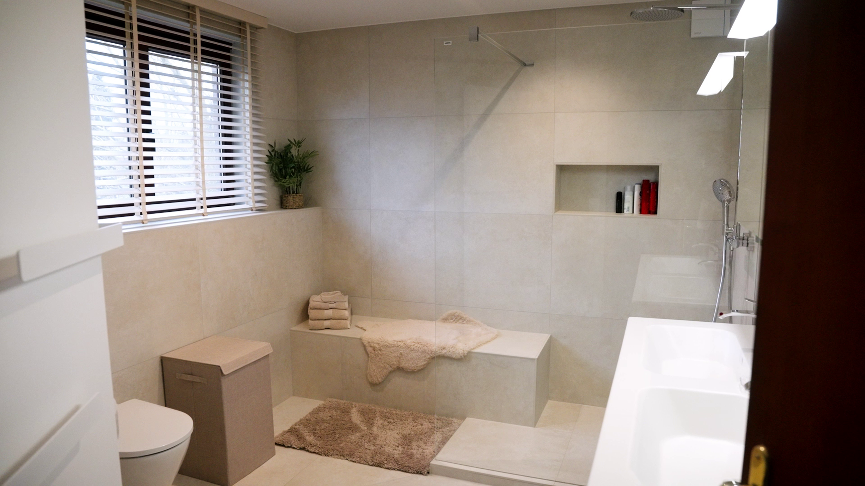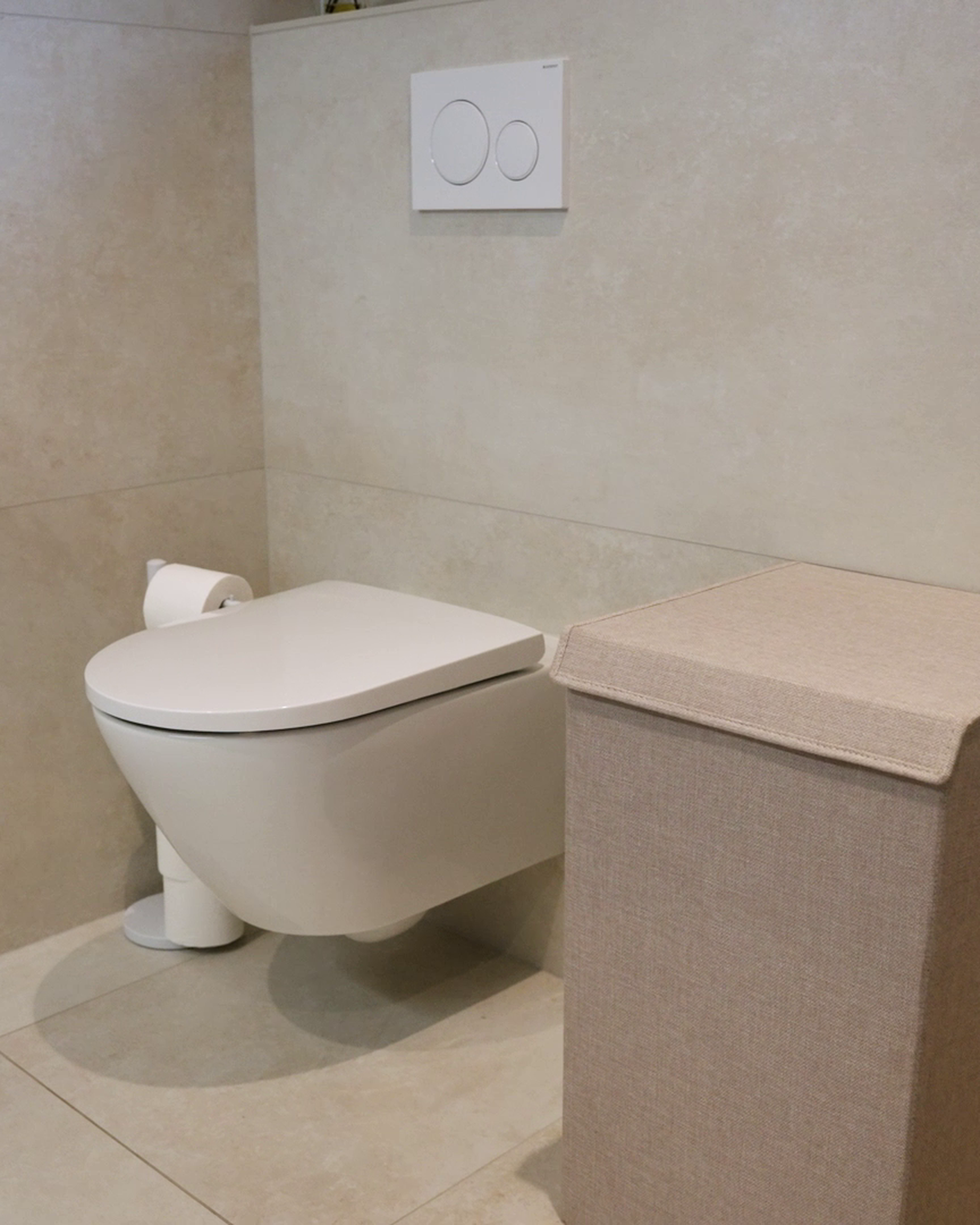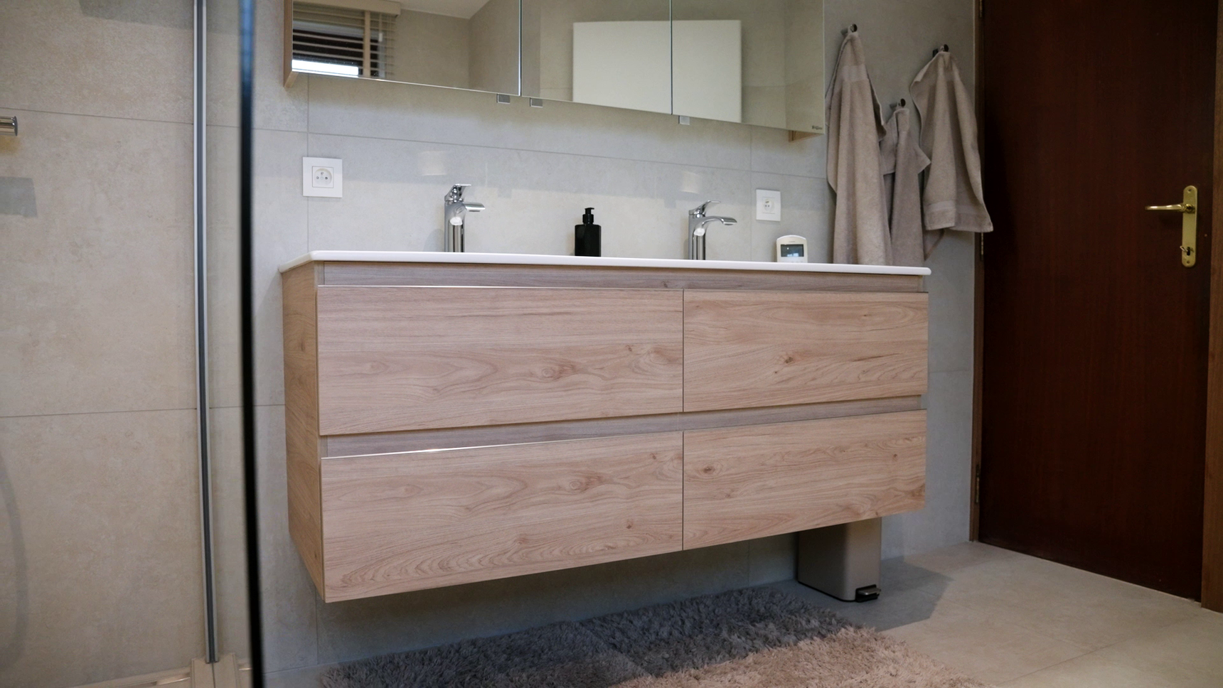 Tijdens de werken in een woning uit 1990 duiken er wel eens verrassingen op. Zo zorgden de bestaande leidingen bij het toilet voor een technische uitdaging. In plaats van een compromis te sluiten, stelde het team van Steylaerts een creatieve oplossing voor: de achterwand van het toilet werd volledig doorgetrokken tot aan de zitbank in de douche. Hierdoor werden de leidingen naadloos en esthetisch weggewerkt. Ann is hier bijzonder opgetogen over: "Het is visueel zoveel mooier geworden; het vormt nu één vloeiend, strak en rustig geheel."