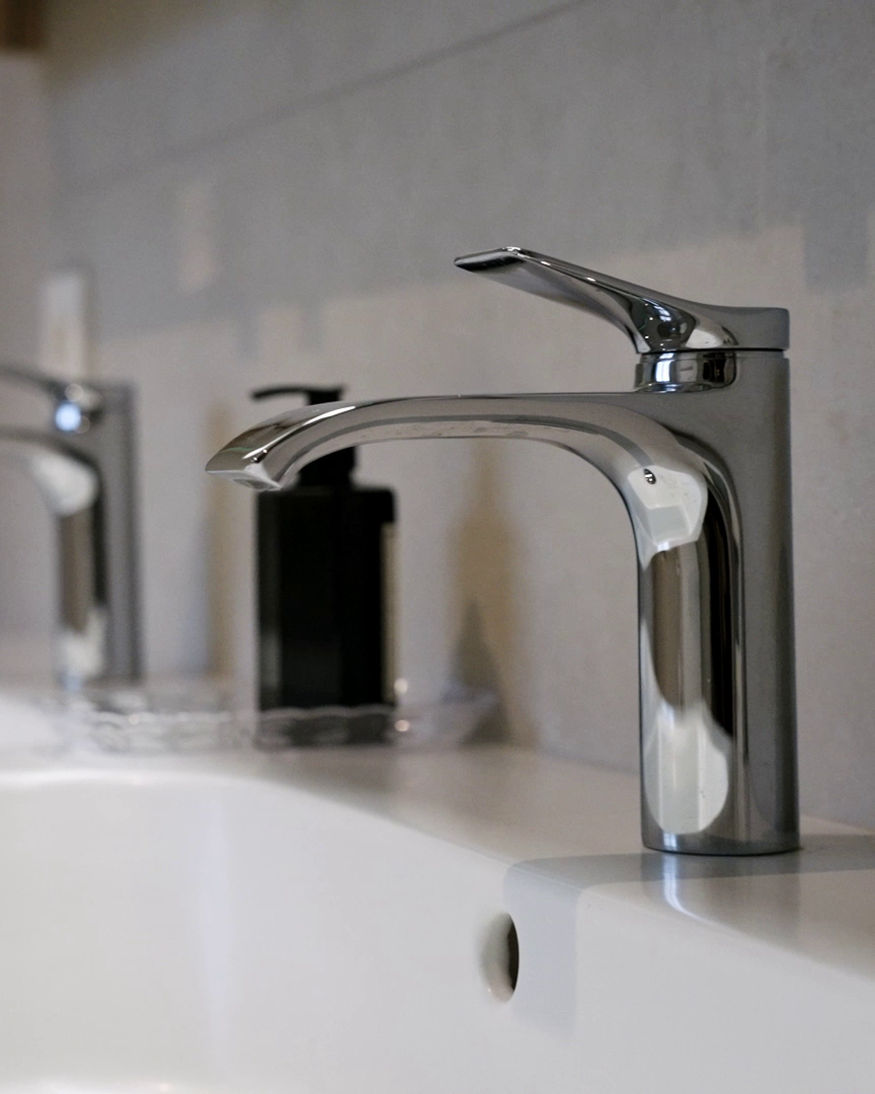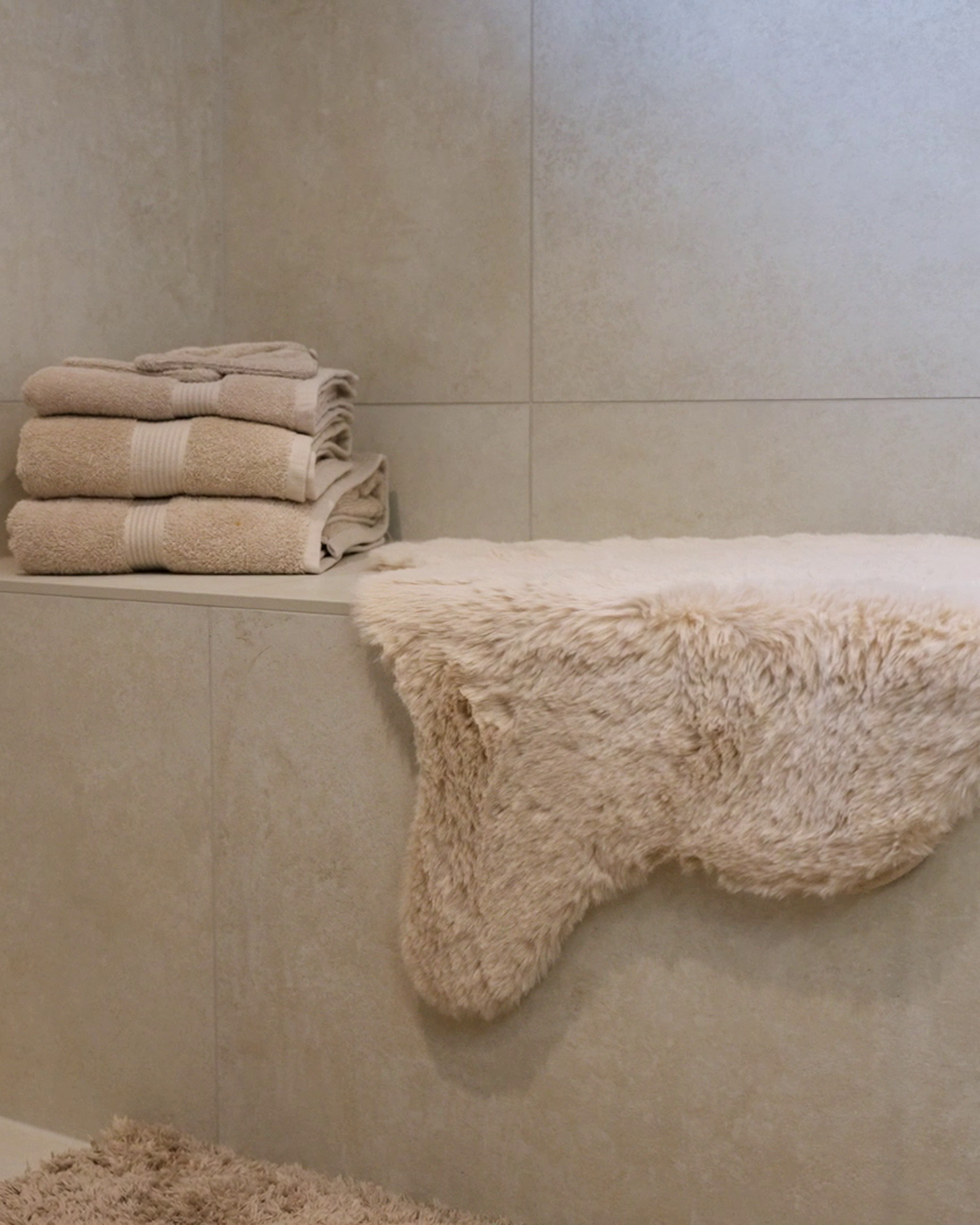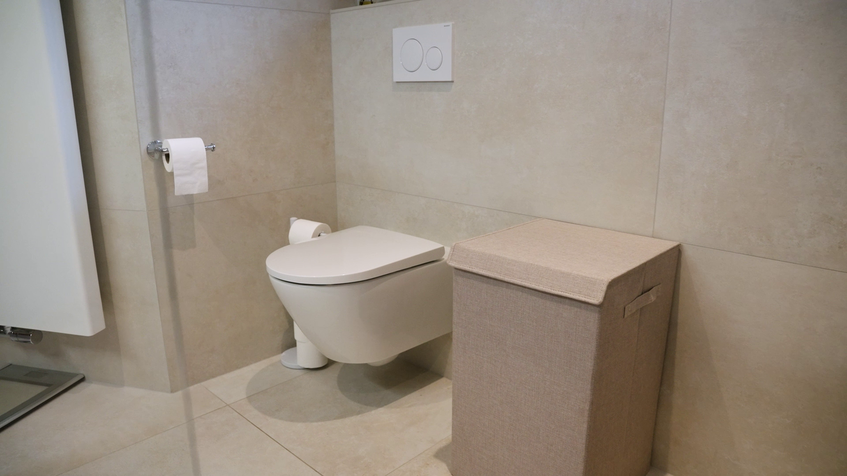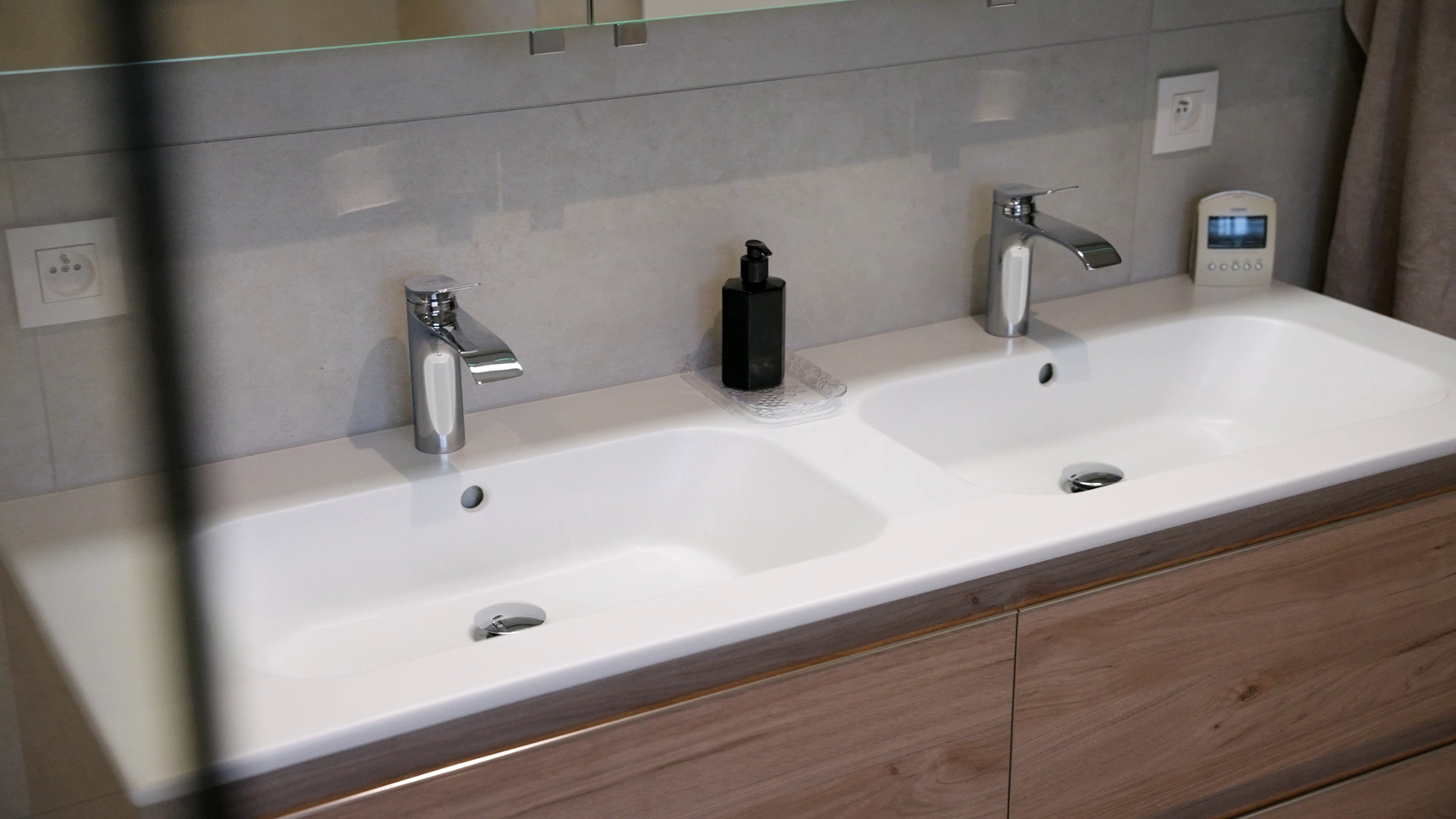 Tijdens de werken in een woning uit 1990 duiken er wel eens verrassingen op. Zo zorgden de bestaande leidingen bij het toilet voor een technische uitdaging. In plaats van een compromis te sluiten, stelde het team van Steylaerts een creatieve oplossing voor: de achterwand van het toilet werd volledig doorgetrokken tot aan de zitbank in de douche. Hierdoor werden de leidingen naadloos en esthetisch weggewerkt. Ann is hier bijzonder opgetogen over: "Het is visueel zoveel mooier geworden; het vormt nu één vloeiend, strak en rustig geheel."