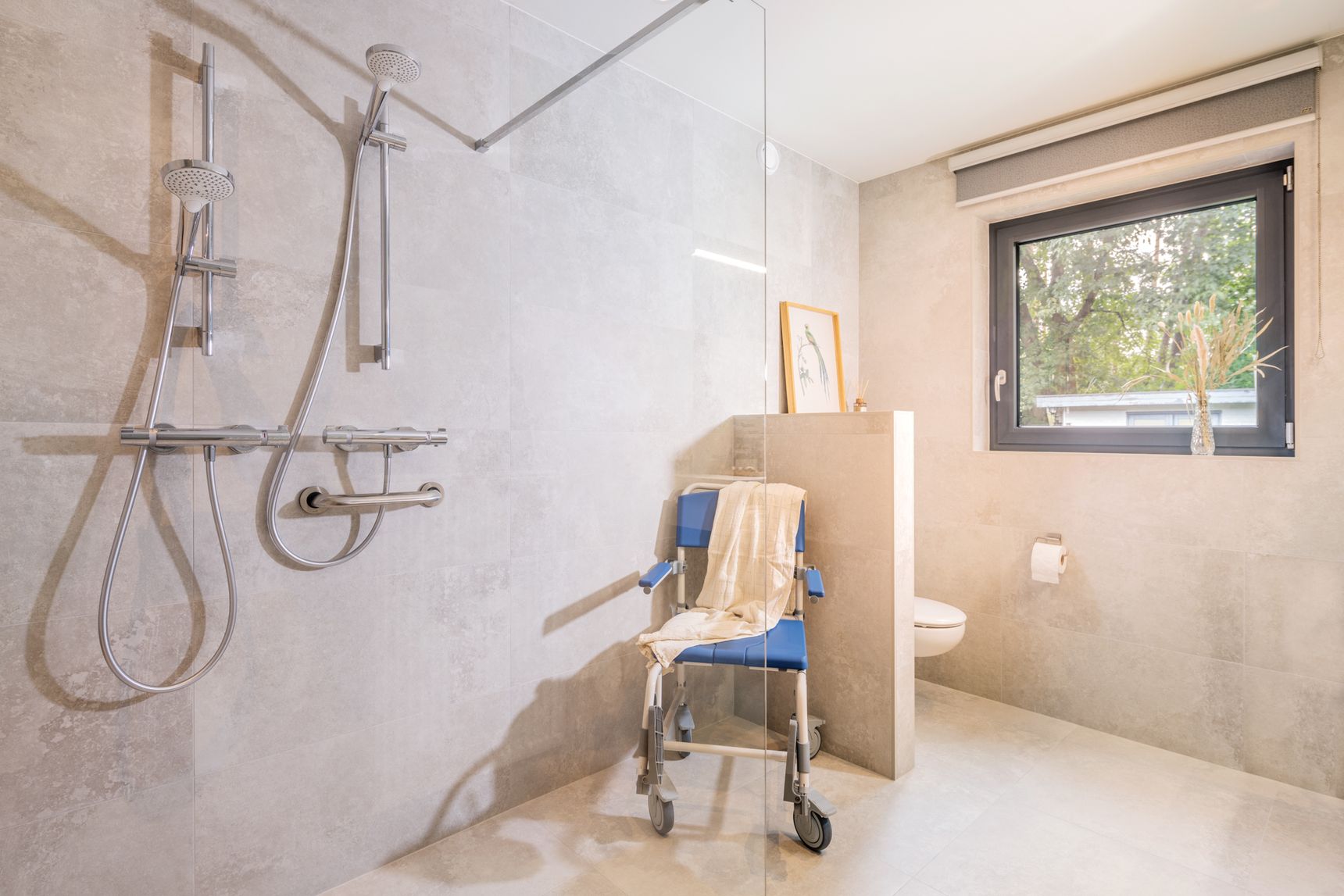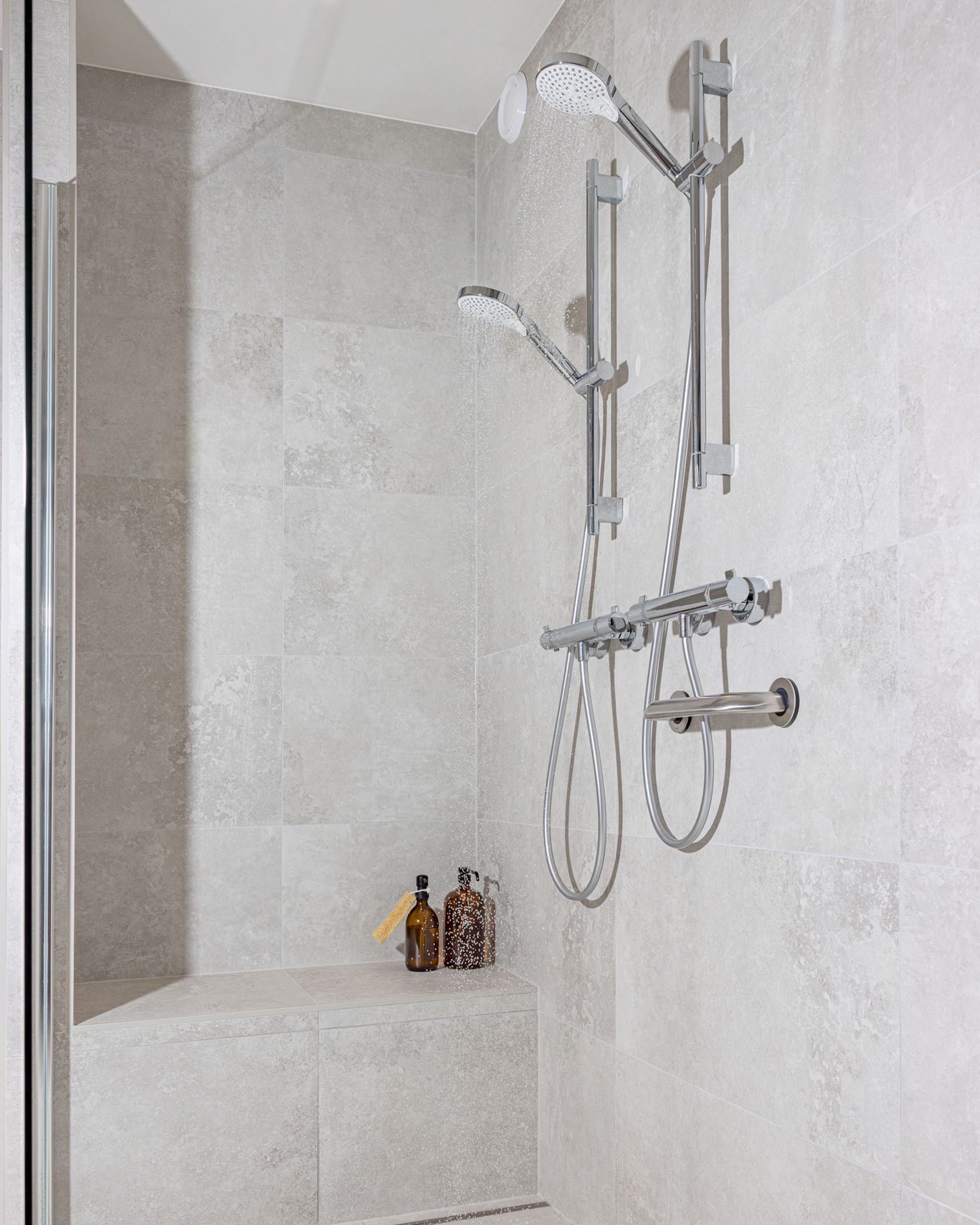 Het pronkstuk van de renovatie? Een volledig aangepaste inloopdouche, of zoals Louis het noemt: zijn "inrijdouche". Deze douche werd speciaal ontworpen om het leven van het koppel gemakkelijker te maken. "Met twee doucheslangen, zodat mijn vrouw me kan helpen, is dit echt perfect voor ons," legt Louis uit. Dit type maatwerk maakt duidelijk hoe Steylaerts niet alleen naar de ruimte kijkt, maar vooral naar de behoeften van de bewoners. Het resultaat is een douche die niet alleen praktisch is, maar er ook nog eens prachtig uitziet.