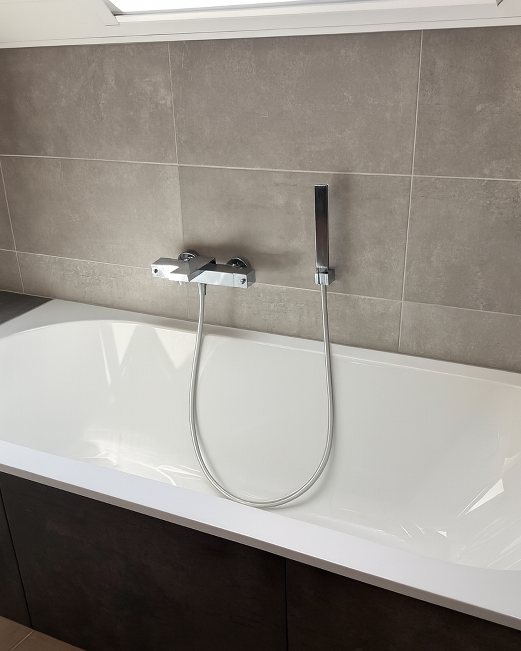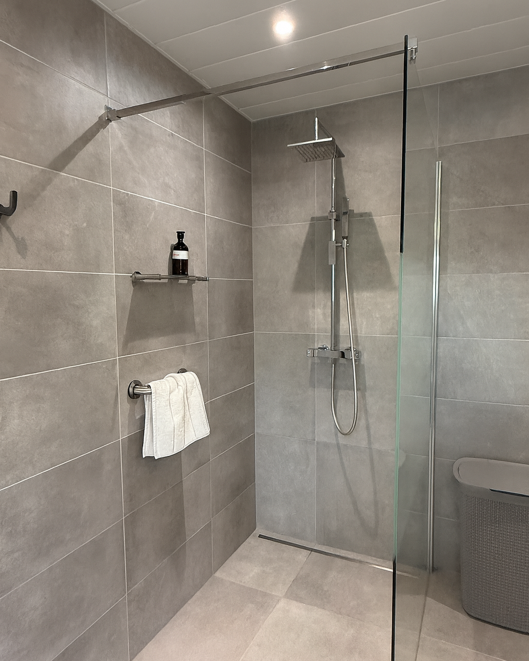 Voor Chris stond één ding vast: de badkamer moest vooral praktisch, veilig en toegankelijk zijn voor Tessa. “De vorige douche bestond uit een douchecabine met douchebak. Voor mijn vrouw was dat op het einde al moeilijk, voor Tessa was het helemaal onmogelijk. Nu is het een ruime inloopdouche met antislipvloer en handgrepen. Geen obstakels meer, geen risico op vallen.”