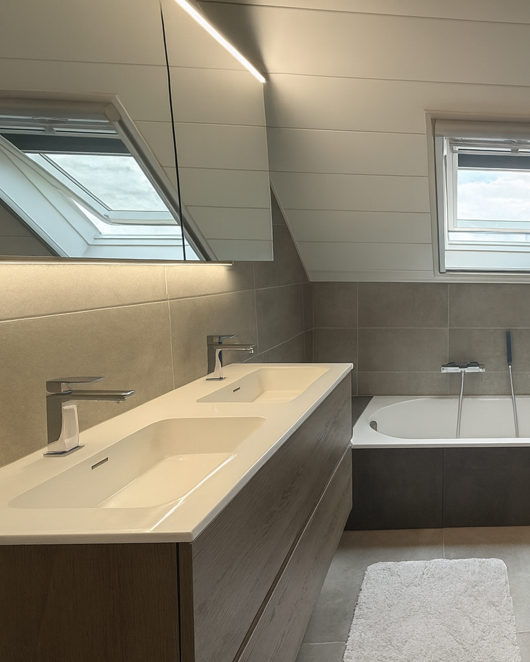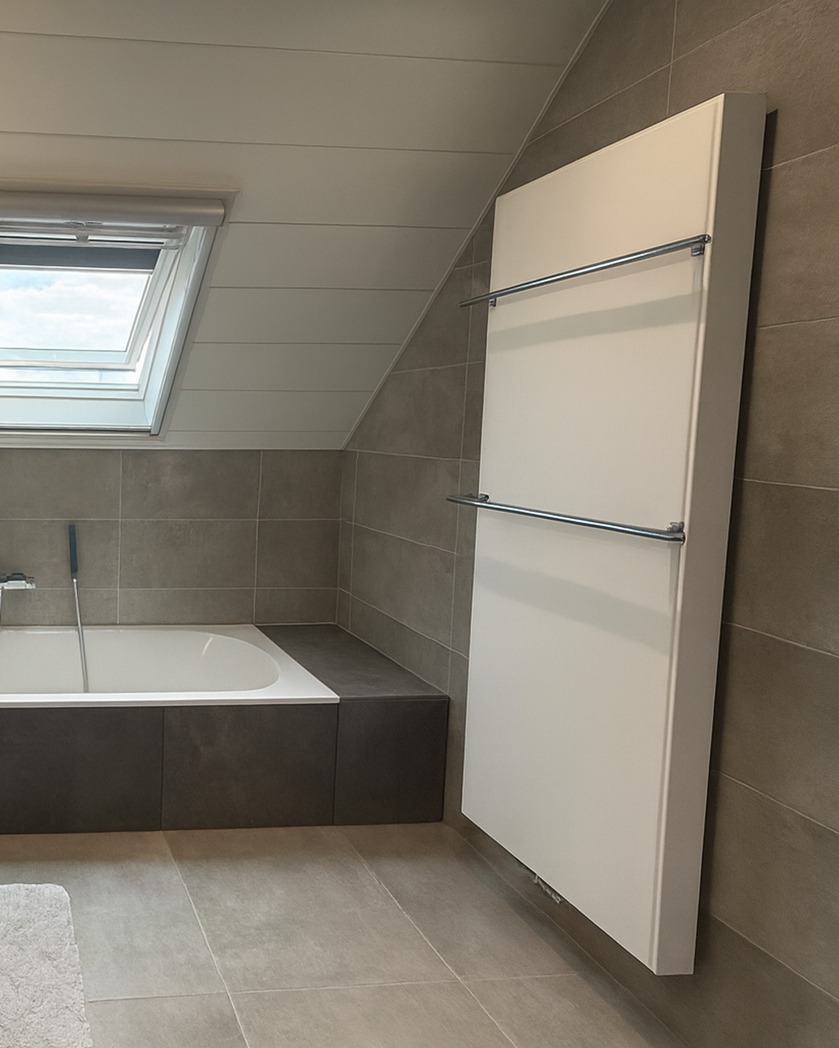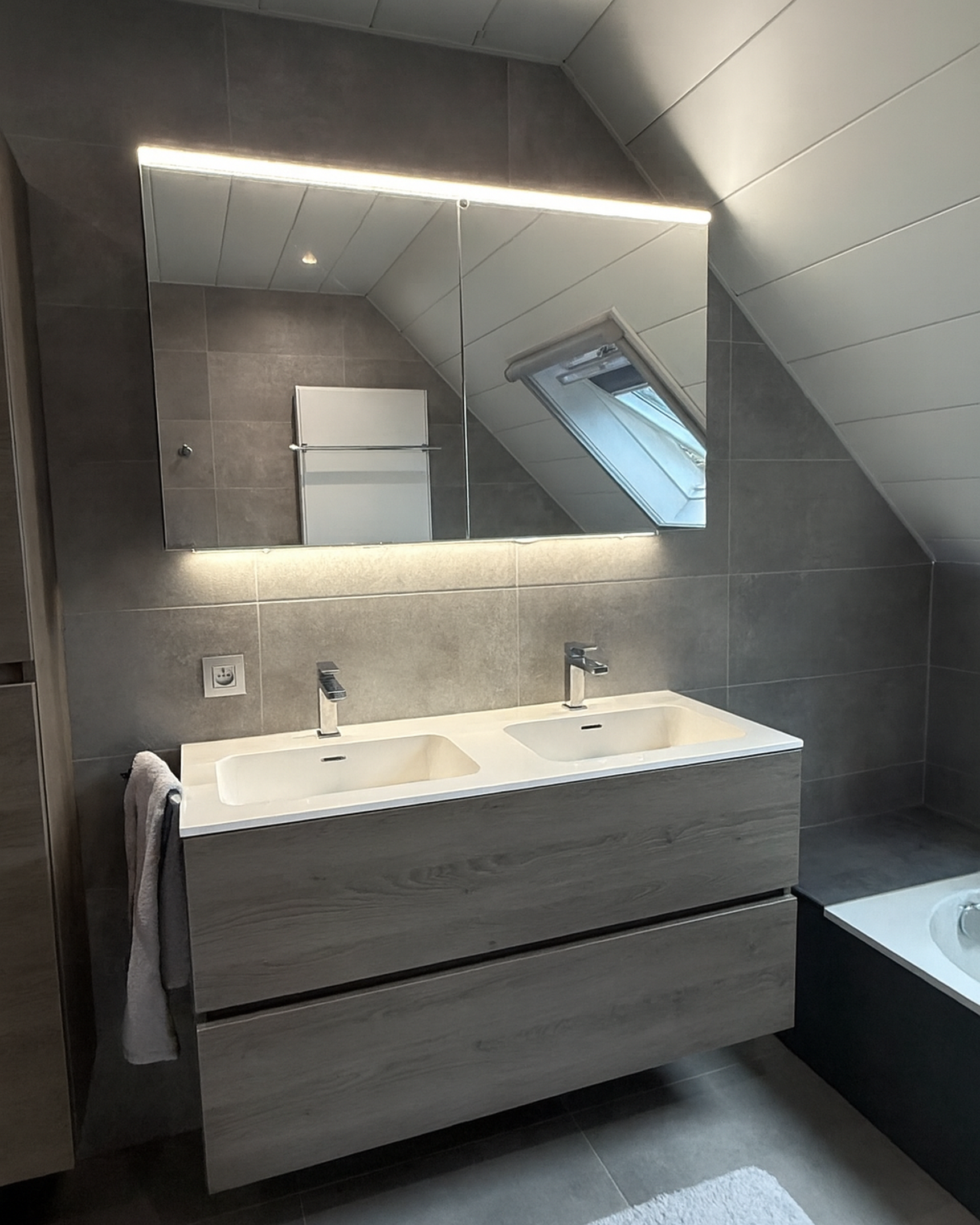Samen met Tessa bezocht Chris de toonzaal van Steylaerts. De indeling, het sanitair en de tegels werden grondig gekozen. “Dat was vooral een keuze van mijn dochter” zegt Chris. “We wilden geen modetrends maar iets tijdloos en rustgevend. Tessa koos daarom zelf voor neutrale grijstinten in de tegels en warm hout als materiaalkeuze voor de badkamermeubels. Voor mij was de stijl minder van belang. Het is haar ruimte, ze kreeg alle vrijheid om te kiezen.”