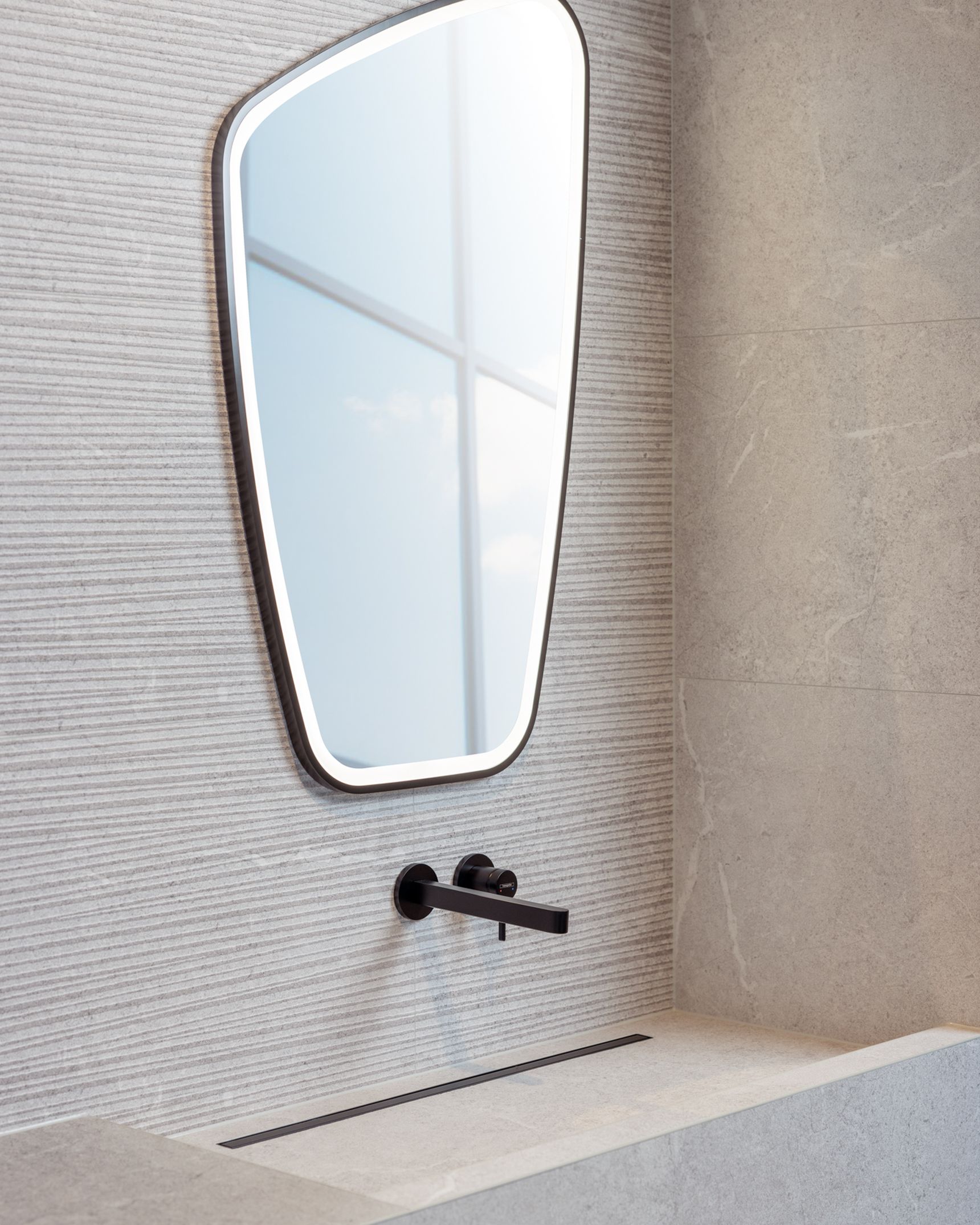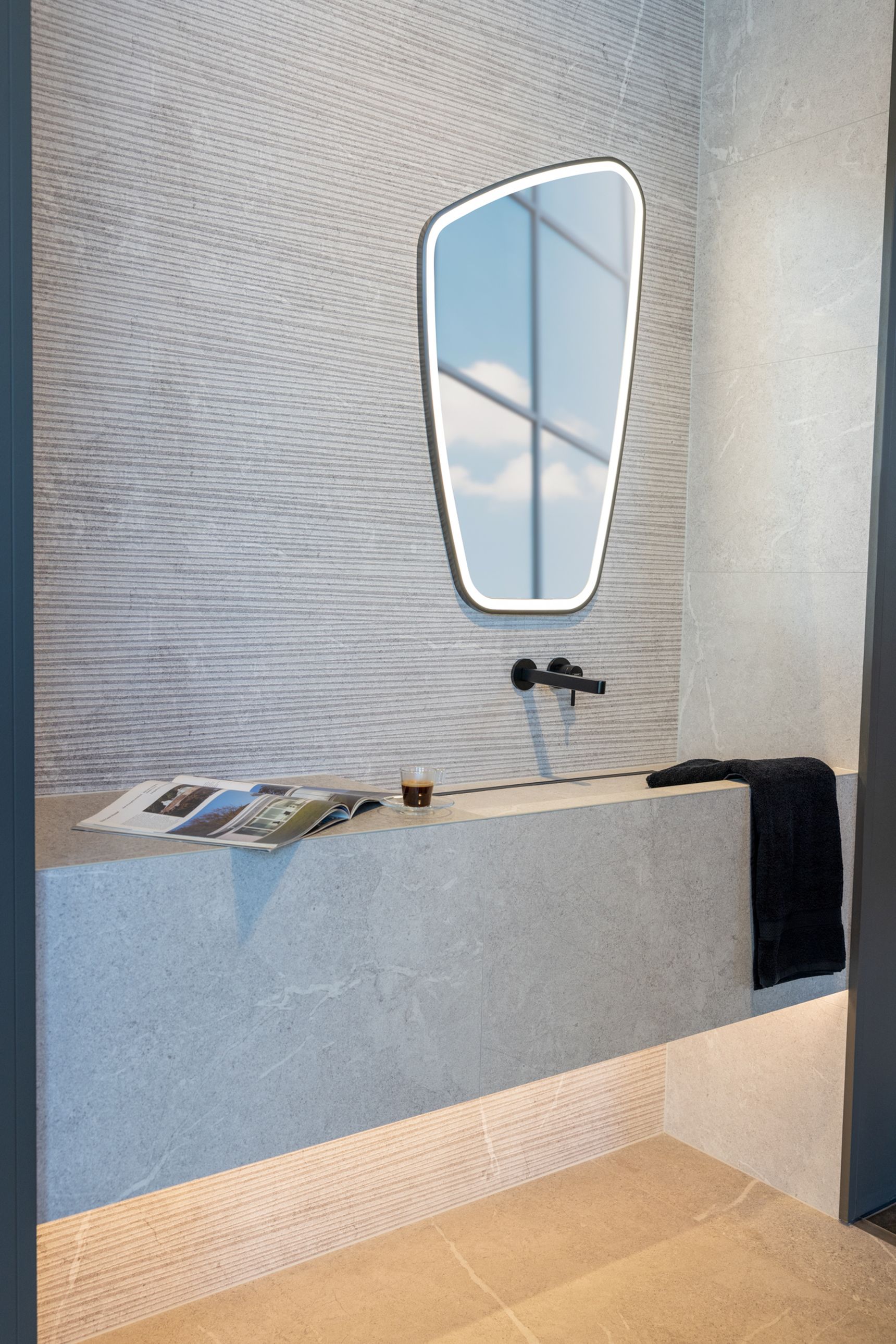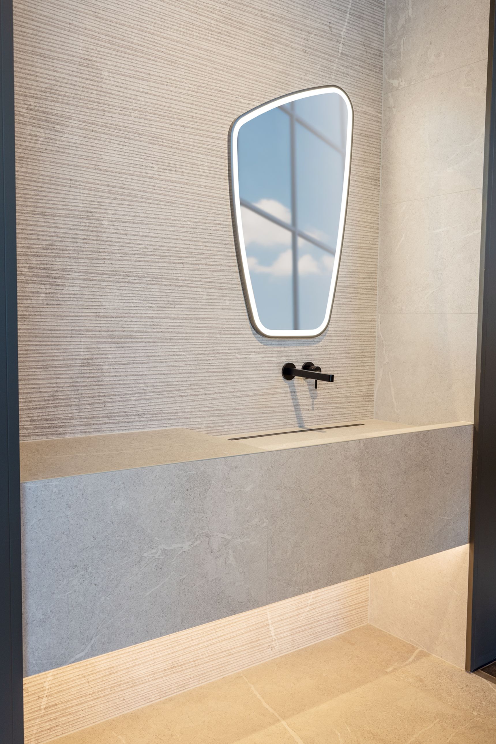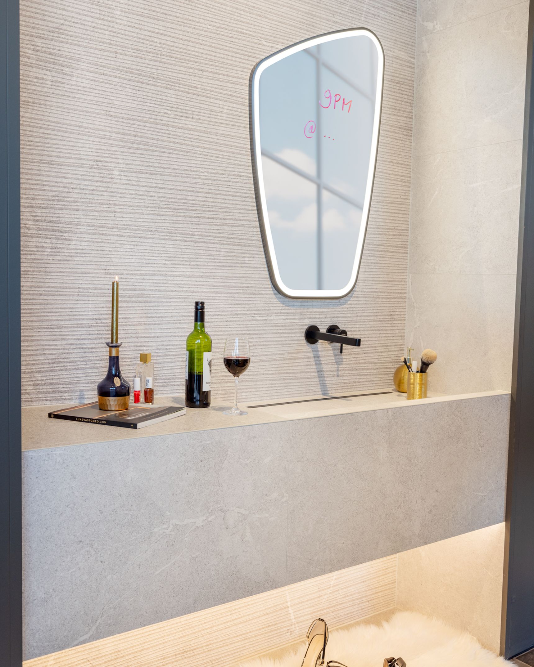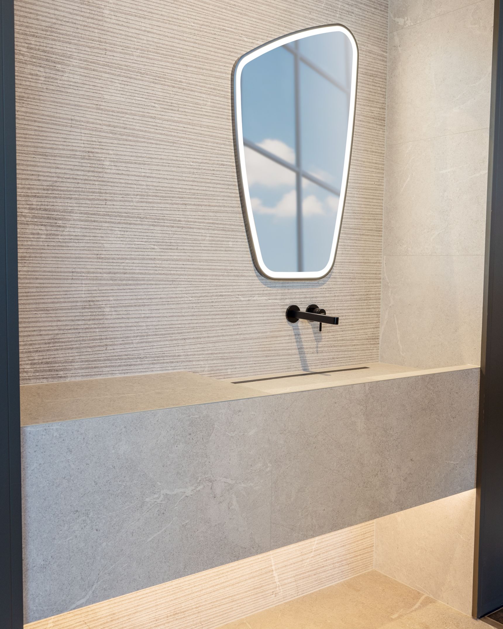 Daar tegenover staat een organische spiegel met geïntegreerde verlichting die bewust afwijkt van de rechte lijnen. “Het is net die tegenstelling die deze ruimte spannend maakt,” zegt Camille. “De spiegel verzacht het geheel en trekt tegelijk de aandacht.”