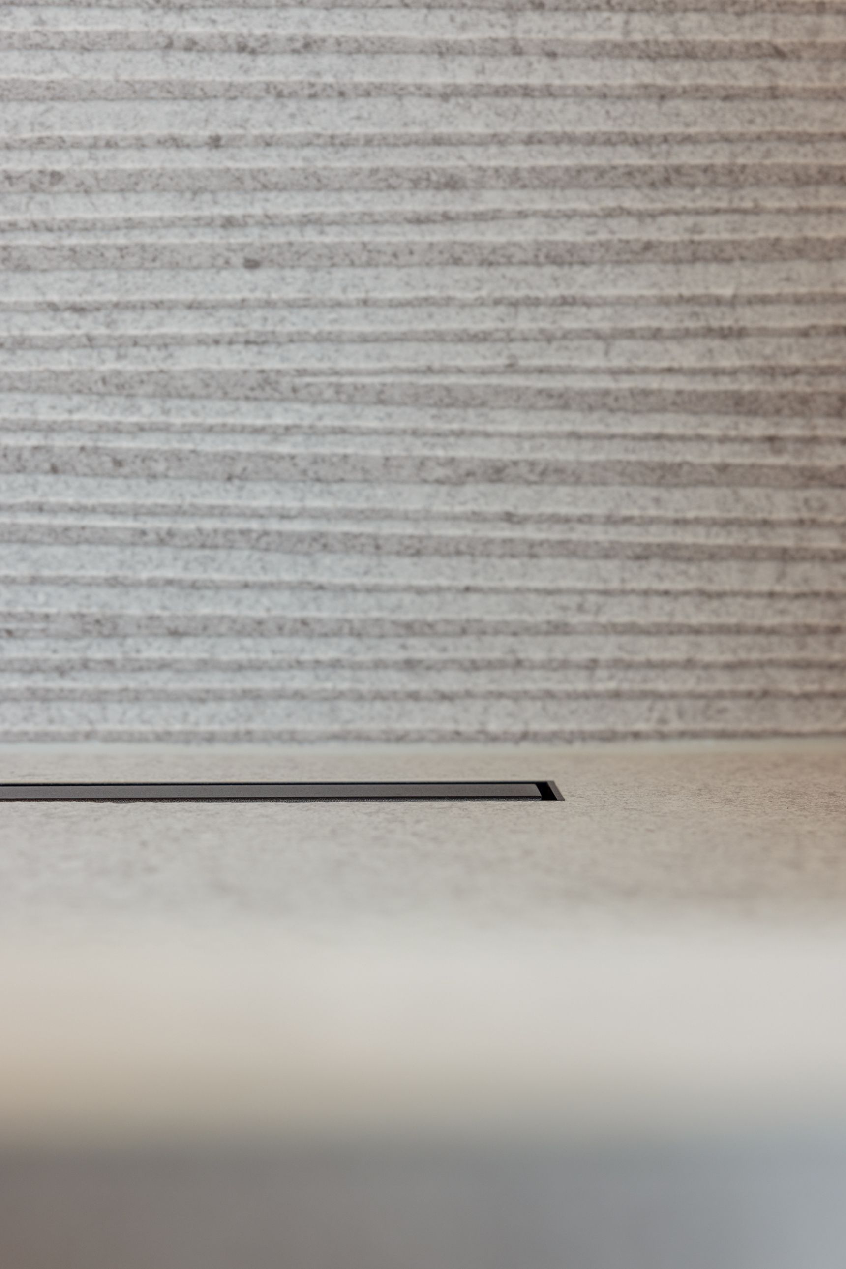 De Carrodrain design douchegoot werd naadloos geïntegreerd in het meubelblad: een slimme ingreep die discretie en functionaliteit verenigt.