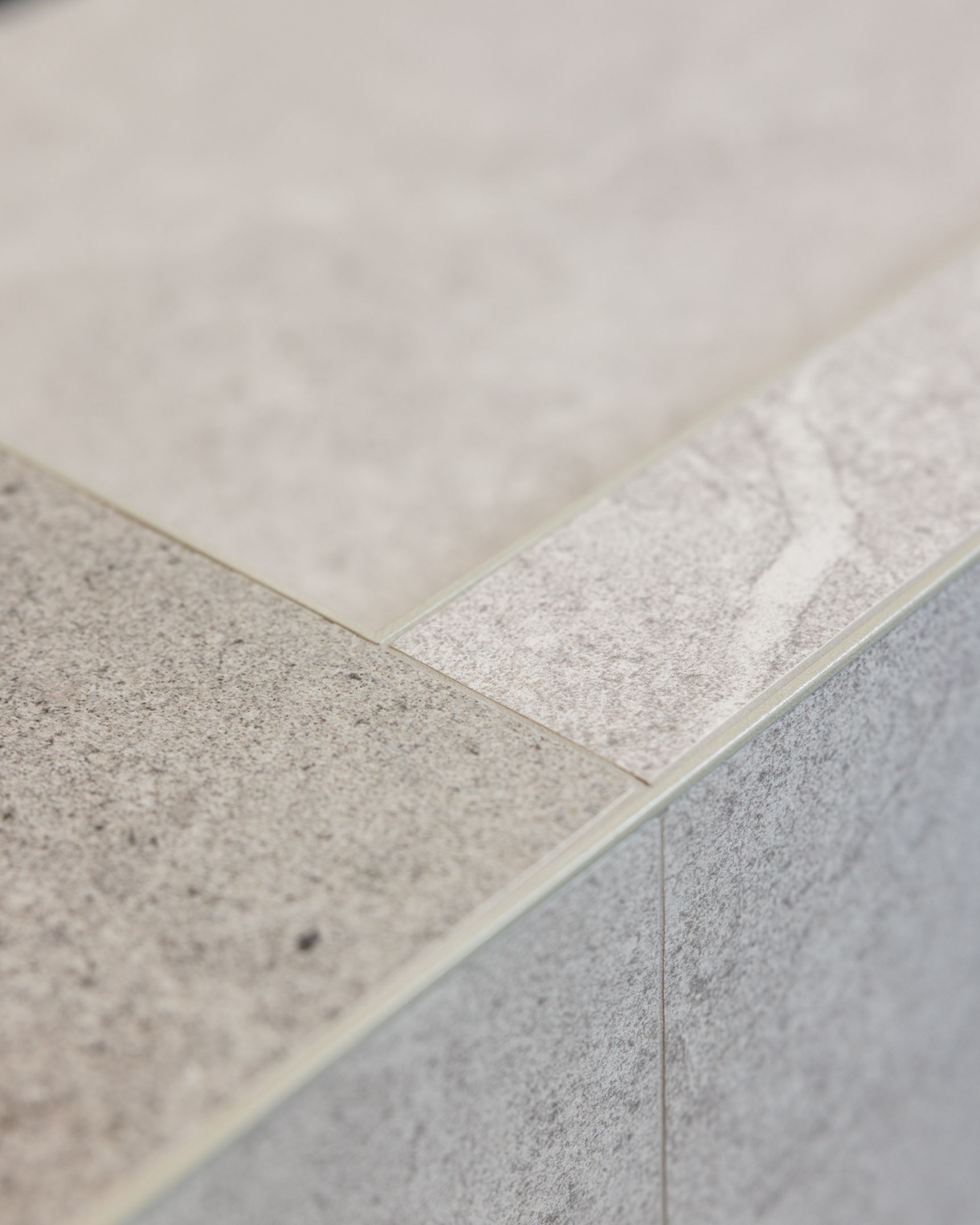 Aan alle hoeken van het meubel werd gekozen voor Finec-profielen: fijne aluminium hoekafwerkingen die bescherming bieden zonder visueel op te vallen. “Het is zo’n detail dat u bijna niet ziet,” zegt Camille, “maar dat net voor die perfecte aflijning zorgt.”