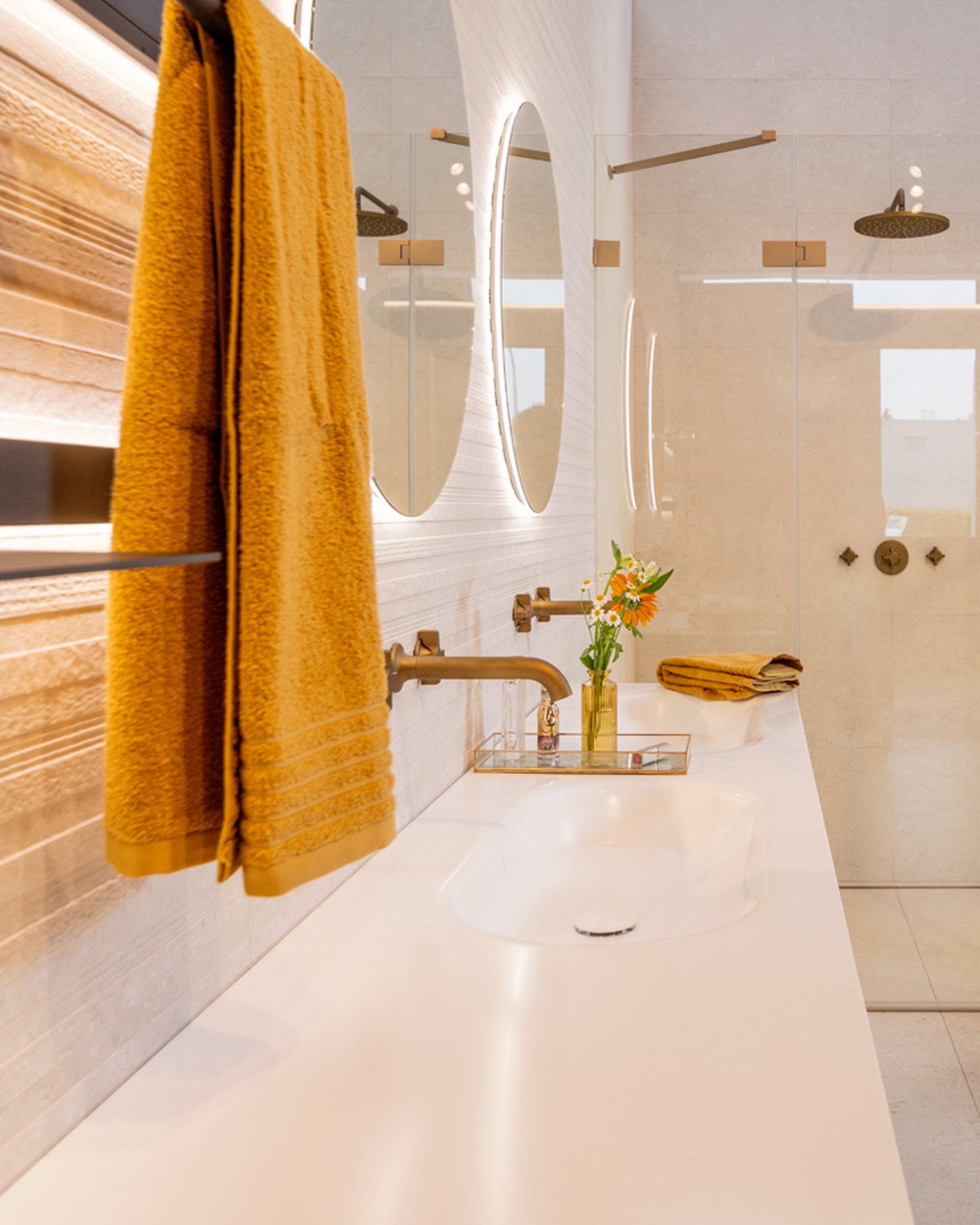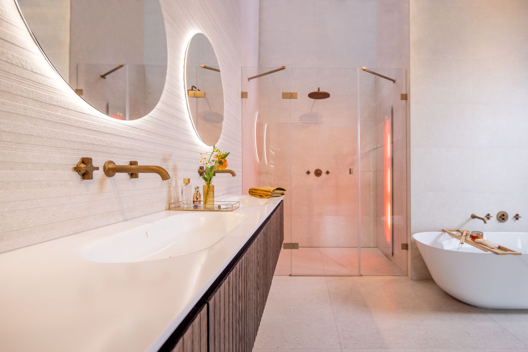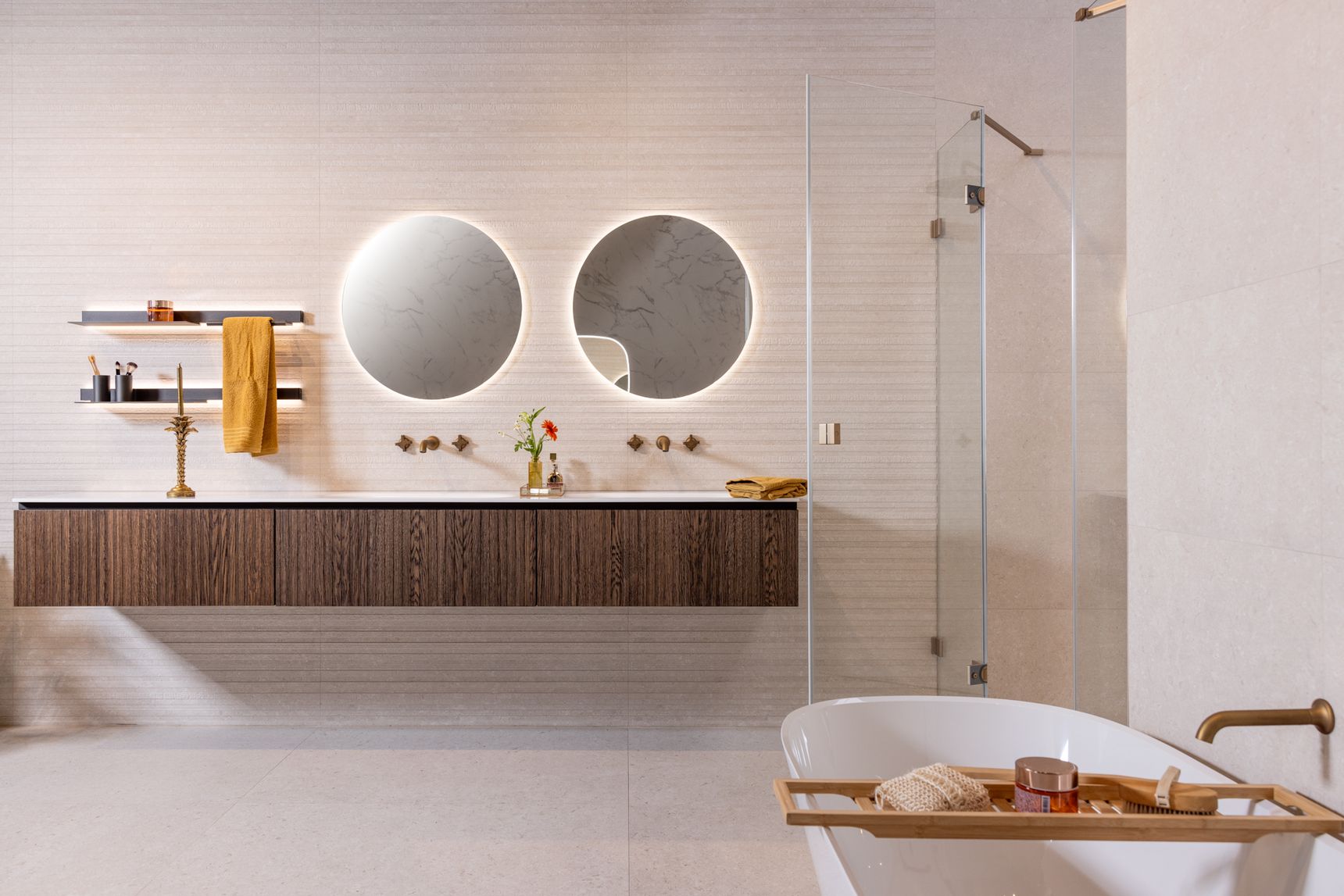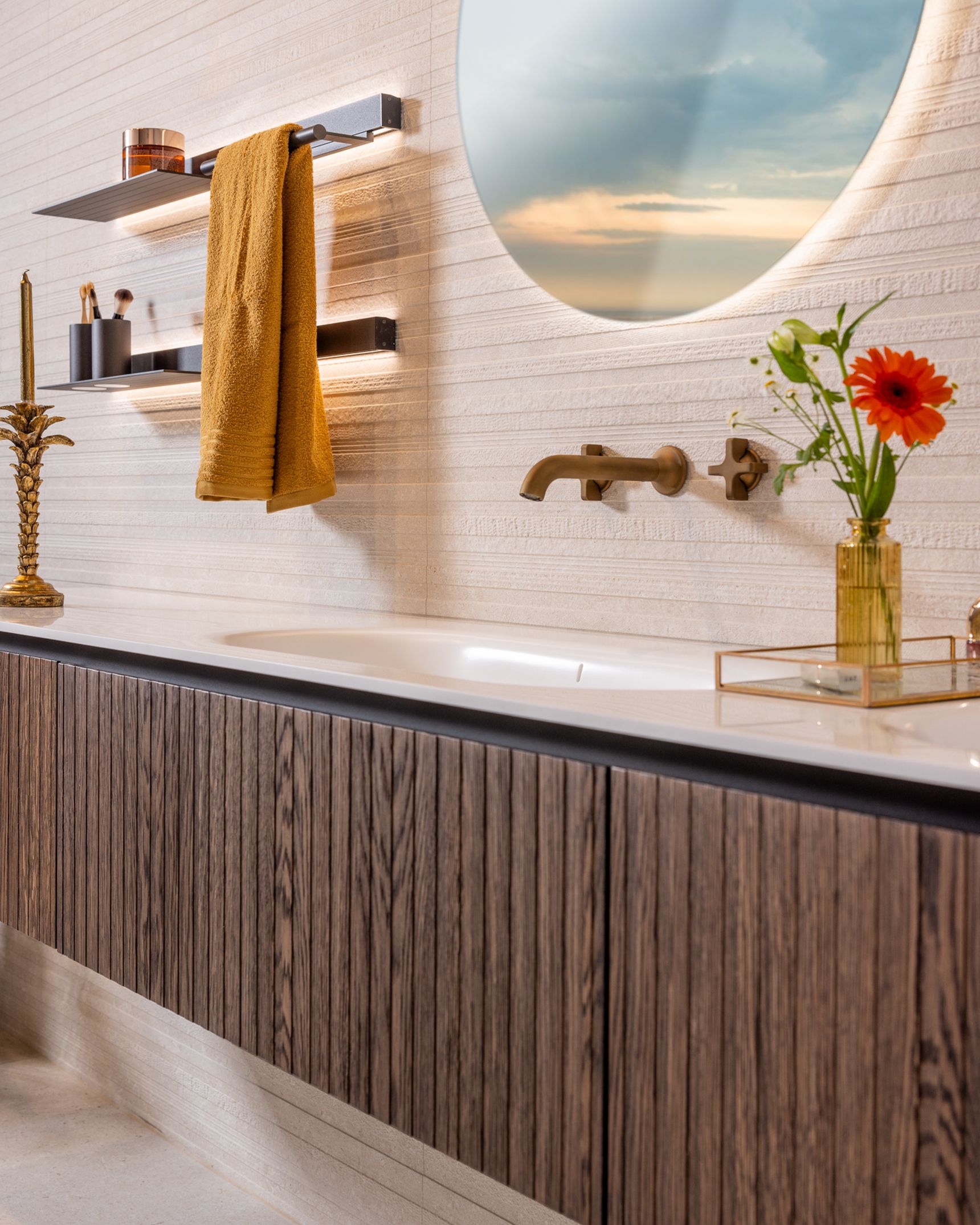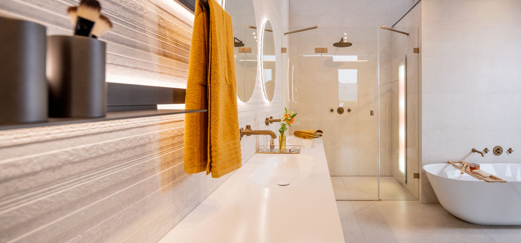 Naast de grote lijnen bepalen de details de uiteindelijke sfeer, waarbij de kranen in licht brons mat een zachter alternatief vormen voor het klassieke chroom of zwart. Brons sluit naadloos aan bij de warme zandtonen van de Modena-tegel, wat zorgt voor een rustig visueel beeld aan de wastafel en in de douche. Om deze texturen ook 's avonds tot hun recht te laten komen, is er indirecte verlichting achter de ronde spiegels en de accessoire-tablets geïntegreerd. Deze zachte lichtinval geeft de wand meer diepte zonder dat het licht verblindt tijdens uw ochtend- of avondritueel.