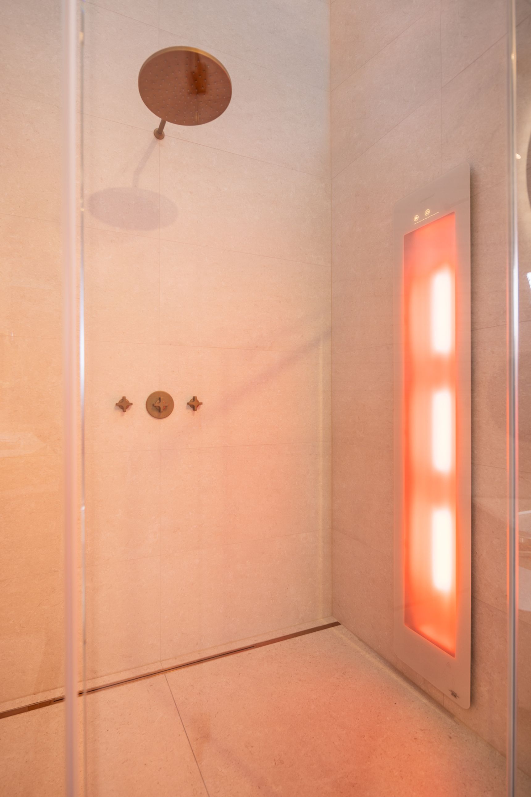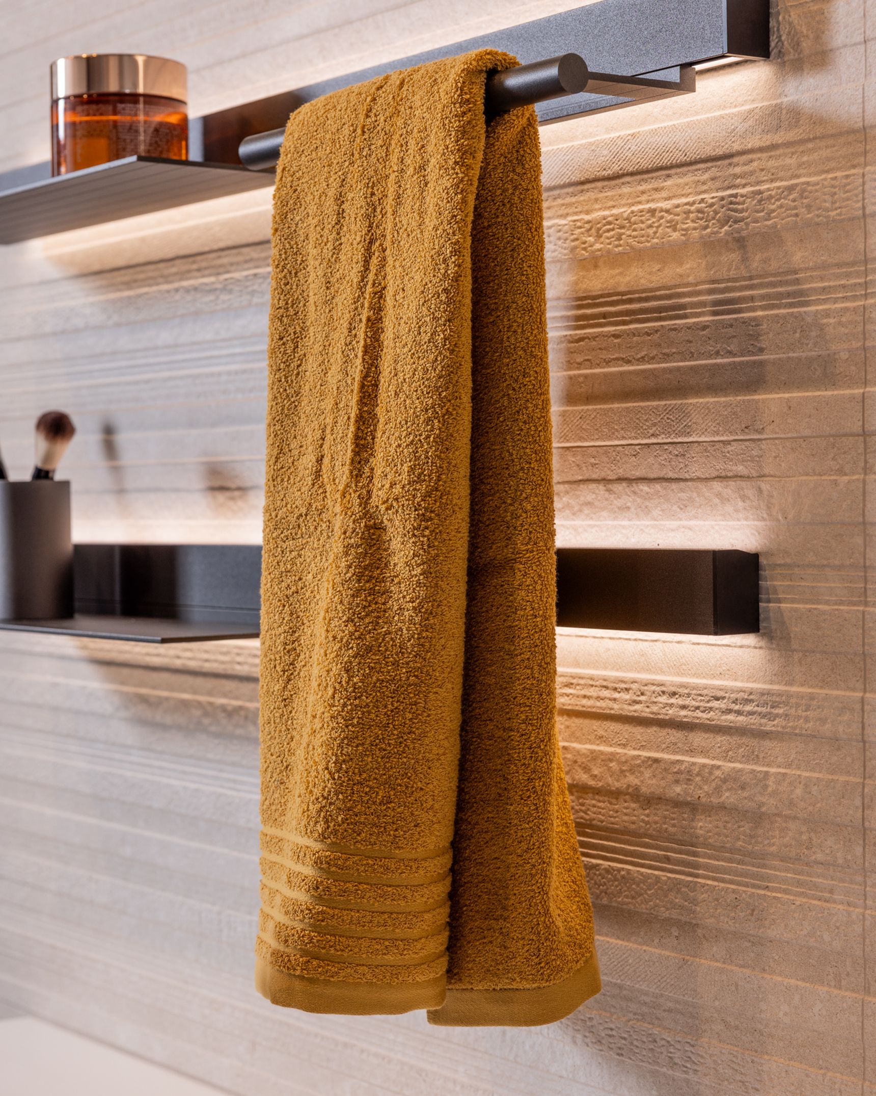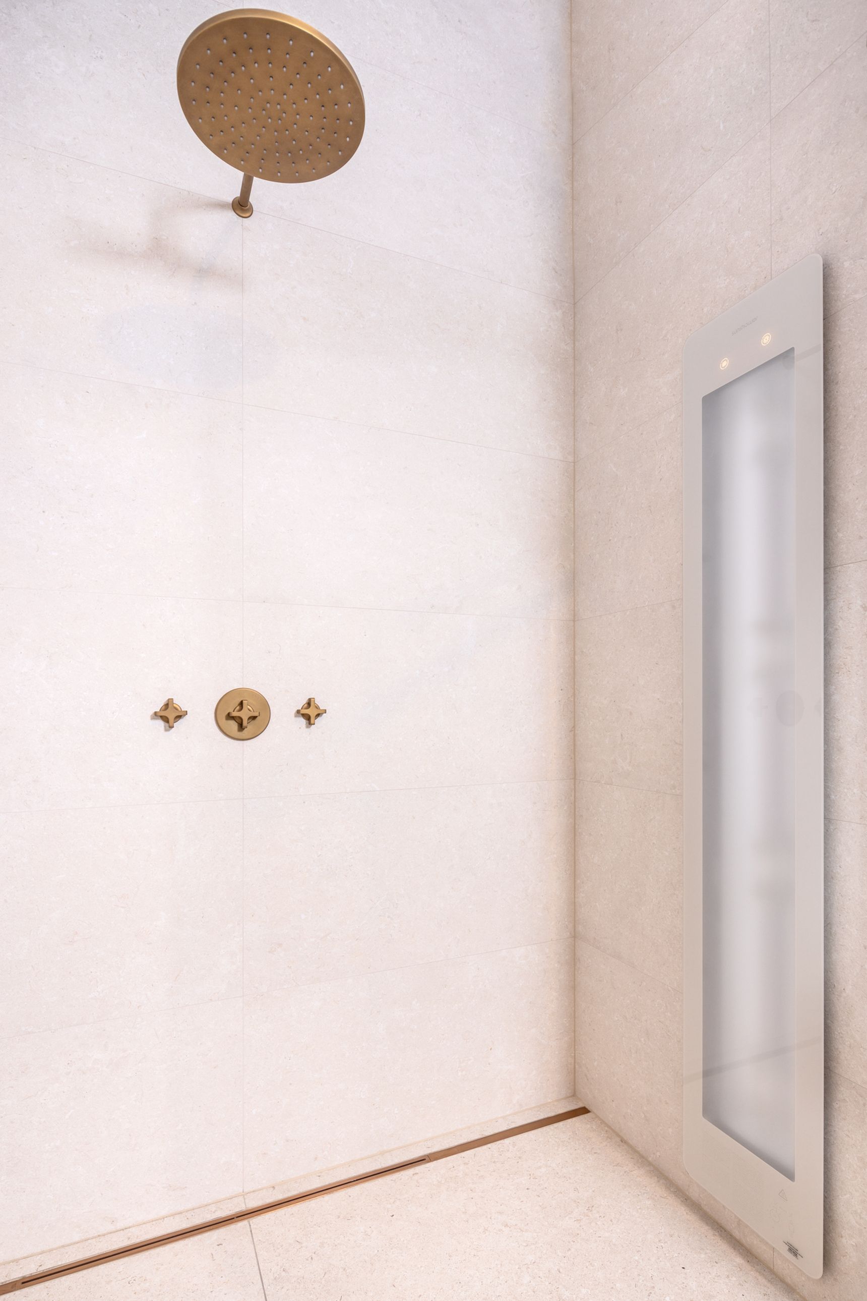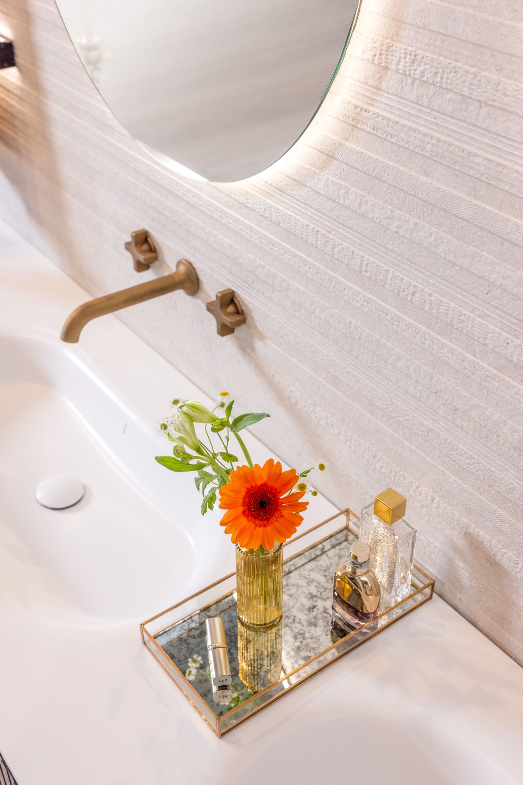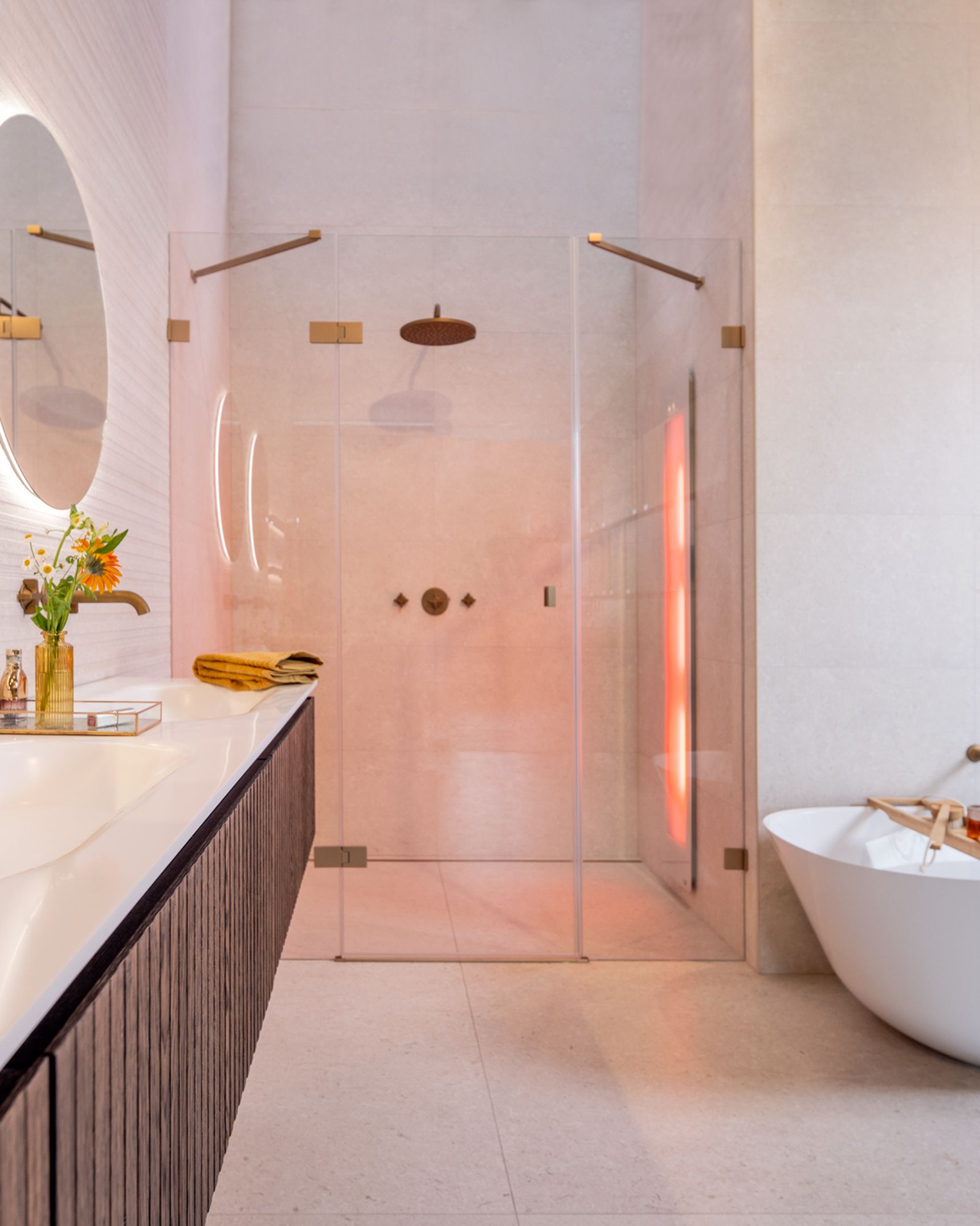 Naast de grote lijnen bepalen de details de uiteindelijke sfeer, waarbij de kranen in licht brons mat een zachter alternatief vormen voor het klassieke chroom of zwart. Brons sluit naadloos aan bij de warme zandtonen van de Modena-tegel, wat zorgt voor een rustig visueel beeld aan de wastafel en in de douche. Om deze texturen ook 's avonds tot hun recht te laten komen, is er indirecte verlichting achter de ronde spiegels en de accessoire-tablets geïntegreerd. Deze zachte lichtinval geeft de wand meer diepte zonder dat het licht verblindt tijdens uw ochtend- of avondritueel.