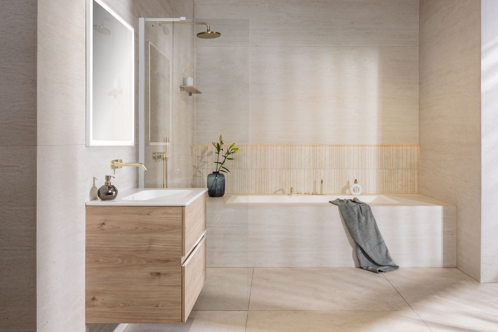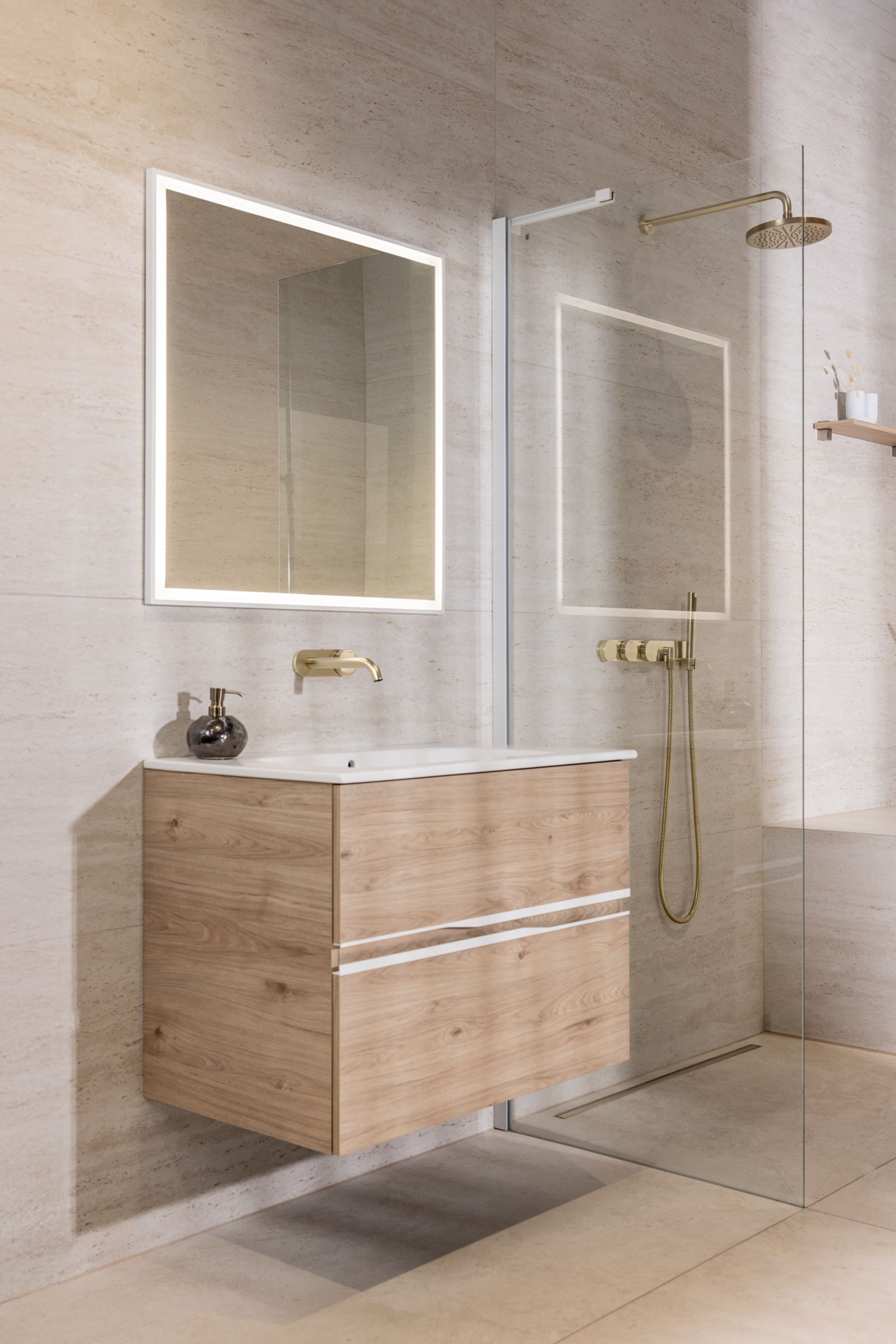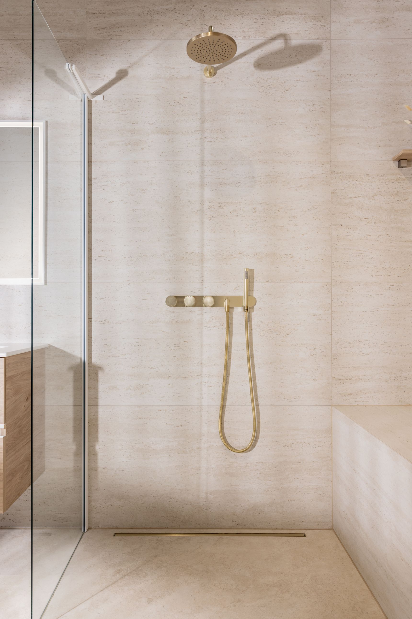 Diezelfde doordachte aanpak zet zich voort in de materiaalkeuzes. Het meubel in licht hout brengt een warme, natuurlijke tegenhanger voor de steen en maakt het geheel zachter. Mat witte grepen en een keramisch tablet zorgen voor een frisse, verfijnde afwerking. Boven het meubel versterkt een spiegel met witte kader en geïntegreerde ledverlichting het gevoel van helderheid. Het champagnekleurige inbouwkraanwerk, dat consequent doorheen de hele badkamer is toegepast, voegt een subtiele luxetoets toe. Zo sluiten natuursteen, hout en metaal naadloos op elkaar aan.