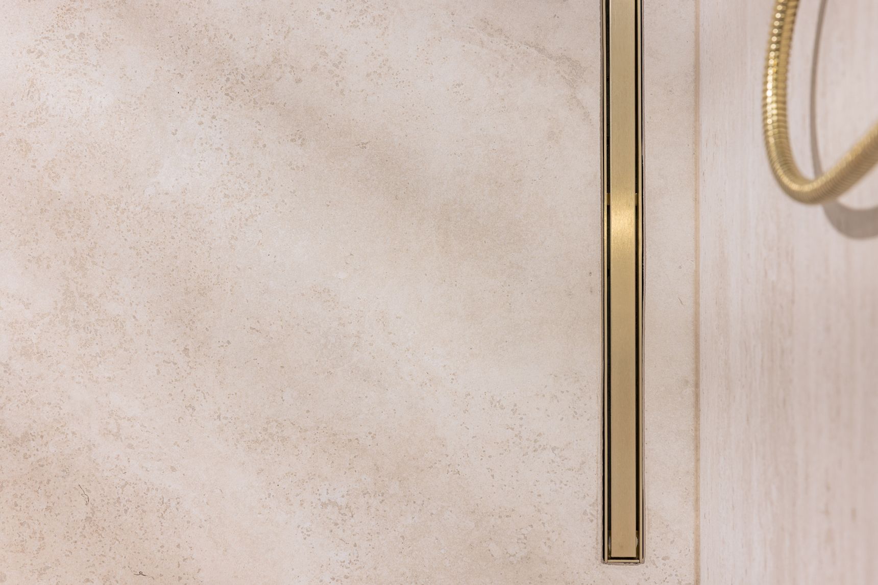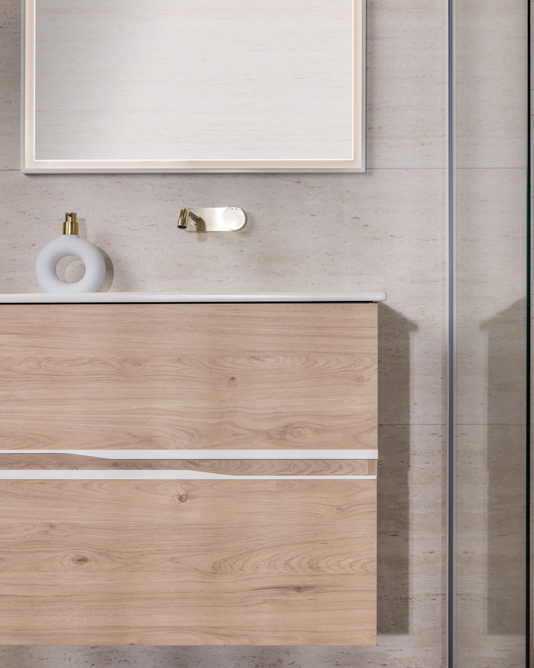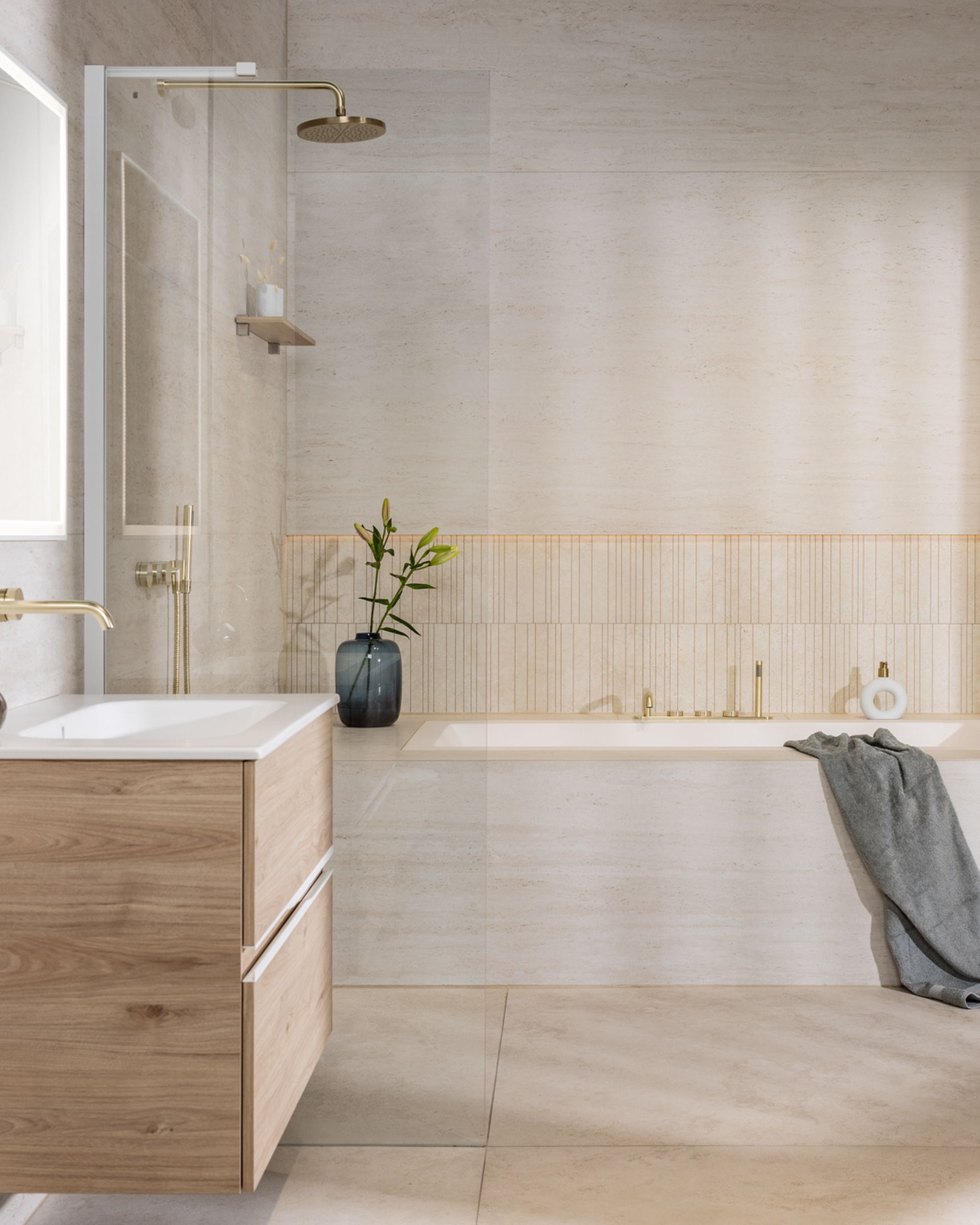 Diezelfde doordachte aanpak zet zich voort in de materiaalkeuzes. Het meubel in licht hout brengt een warme, natuurlijke tegenhanger voor de steen en maakt het geheel zachter. Mat witte grepen en een keramisch tablet zorgen voor een frisse, verfijnde afwerking. Boven het meubel versterkt een spiegel met witte kader en geïntegreerde ledverlichting het gevoel van helderheid. Het champagnekleurige inbouwkraanwerk, dat consequent doorheen de hele badkamer is toegepast, voegt een subtiele luxetoets toe. Zo sluiten natuursteen, hout en metaal naadloos op elkaar aan.
