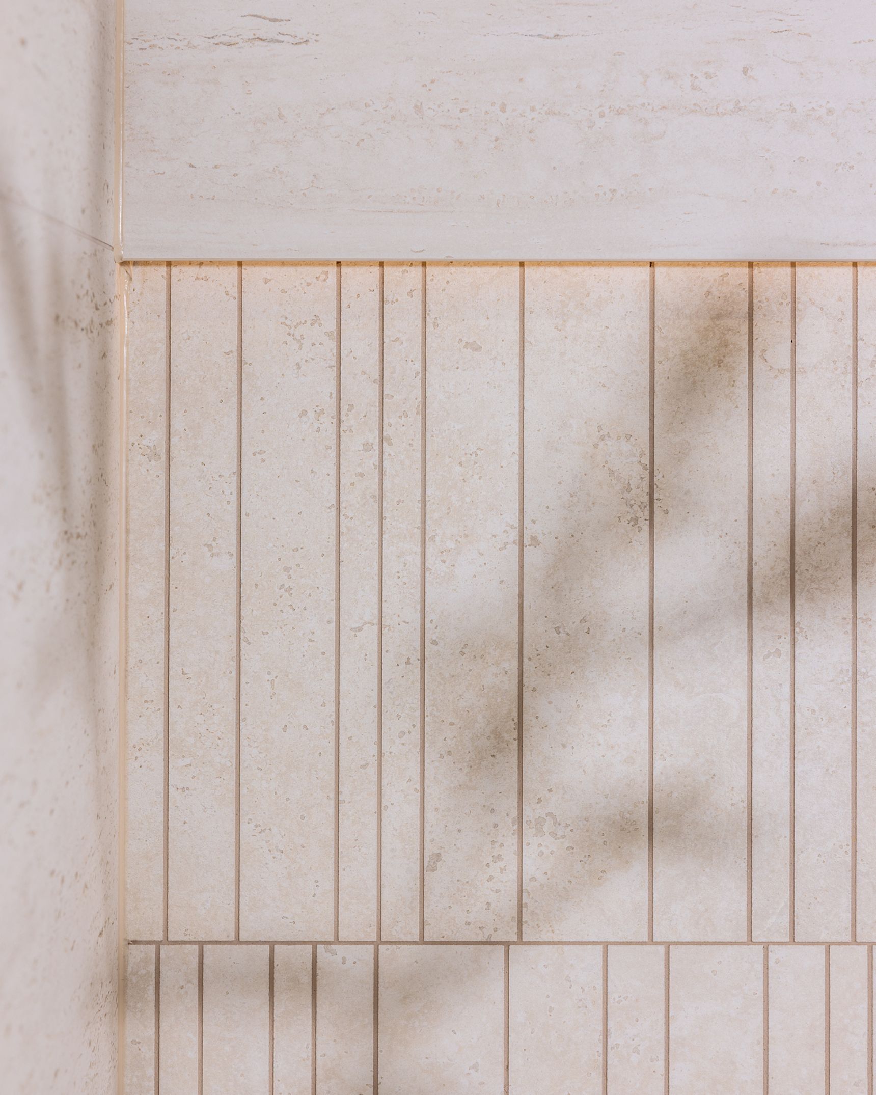 Doordat de travertino tegel overal terugkomt, krijgt de ruimte een vanzelfsprekende samenhang. Op de vloer zorgen subtiele, wolkachtige nuances voor diepte en beweging. Naarmate uw blik omhooggaat, worden de lijnen in de steen rustiger en meer richtinggevend, waardoor de wanden extra elegant ogen. Het grote formaat van de vloertegels beperkt het aantal voegen en versterkt het ruimtelijke effect. Wat begint als een esthetische keuze, groeit zo uit tot een slimme manier om een compacte badkamer groter te laten aanvoelen.