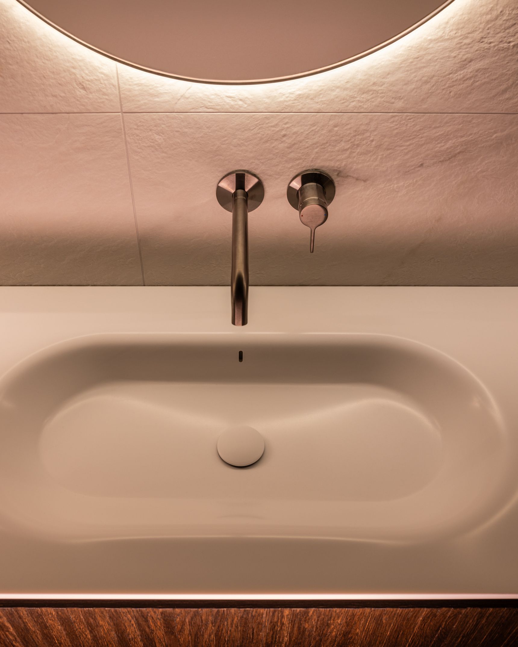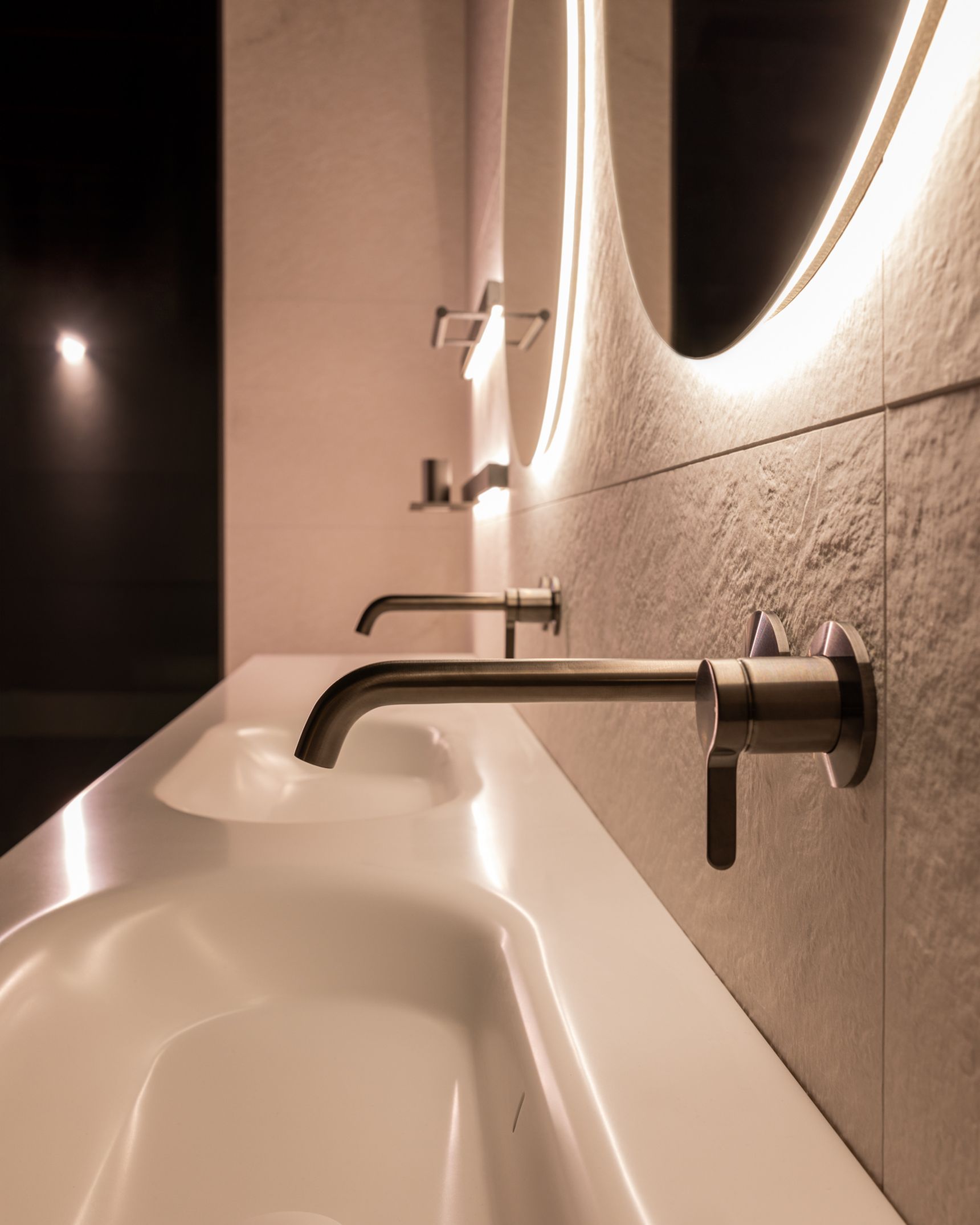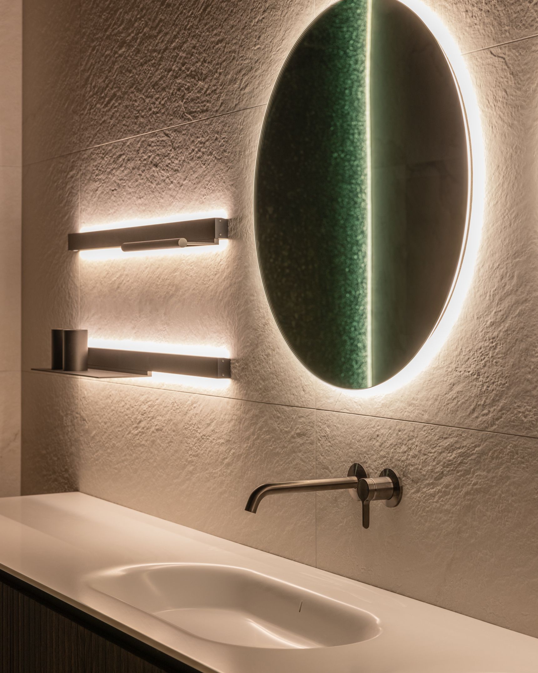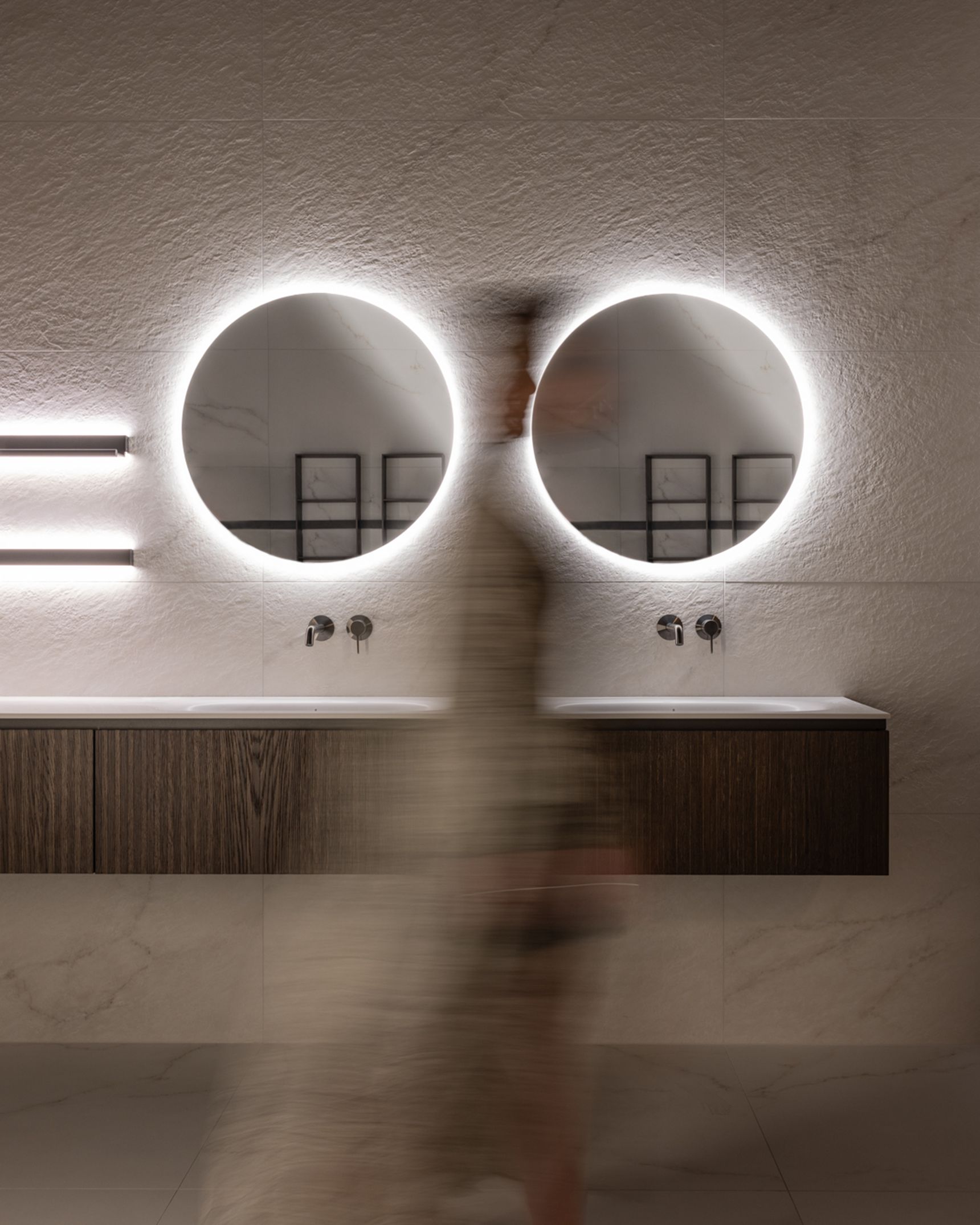 Een perfect uitgebalanceerd geheel waarin elk lichtpunt een rol speelt, dat was het startpunt voor deze badkamer. Het eerste wat dan ook opvalt, zijn de ronde spiegels die baden in een zachte, haloachtige gloed die het reliëf van de marmertegel subtiel accentueert. Aan de linkerzijde zorgen horizontale lichtprofielen met geïntegreerde verplaatsbare wandplanken dan weer voor extra elegantie én gebruiksgemak. Het licht maakt de textuur van de tegels voelbaar, brengt schaduw en diepte, en zorgt tegelijk voor een warme, uitnodigende sfeer.