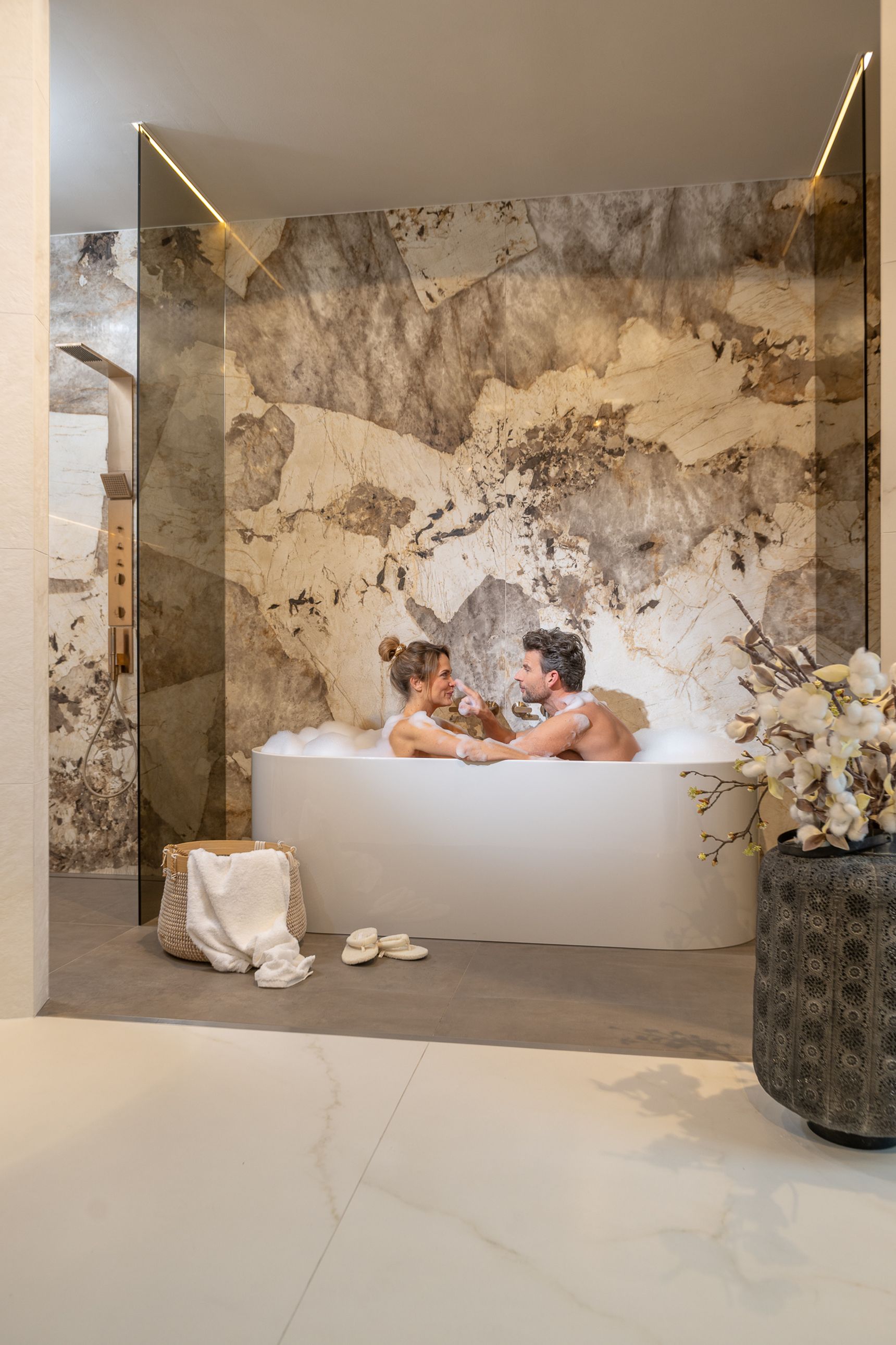 Op blote voeten in uw badkamer, alsof u even helemaal alleen bent in een uitgestrekte woestijn. Warm, stil en volledig in balans. In deze realisatie staat de Desert Soul megastone centraal: een tegel die niet alleen een ruimte aankleedt, maar ook een gevoel oproept. Alles in deze ruimte is opgebouwd rond dat ene gevoel: vertragen, tot rust komen en even weg zijn van de drukte.