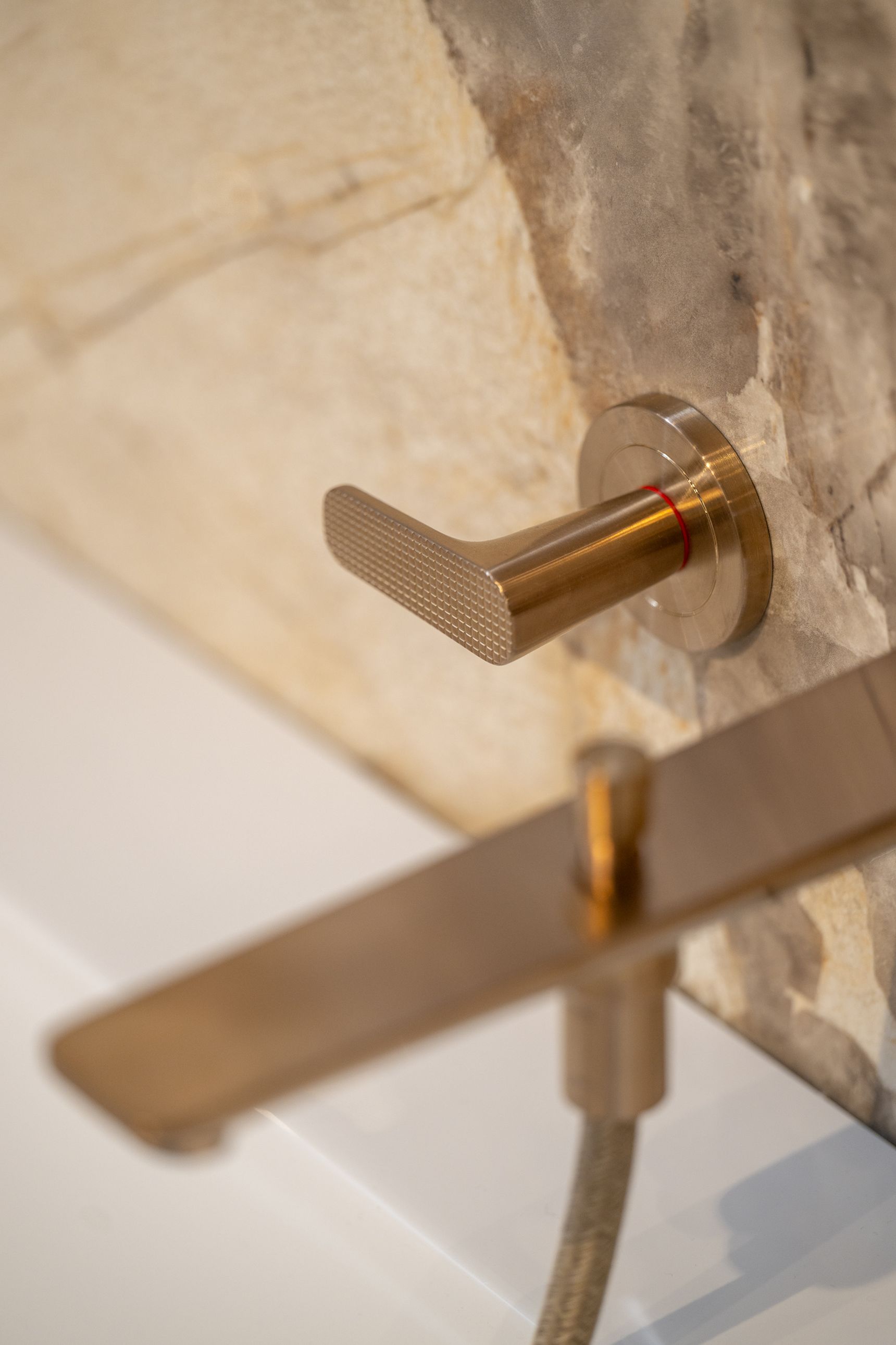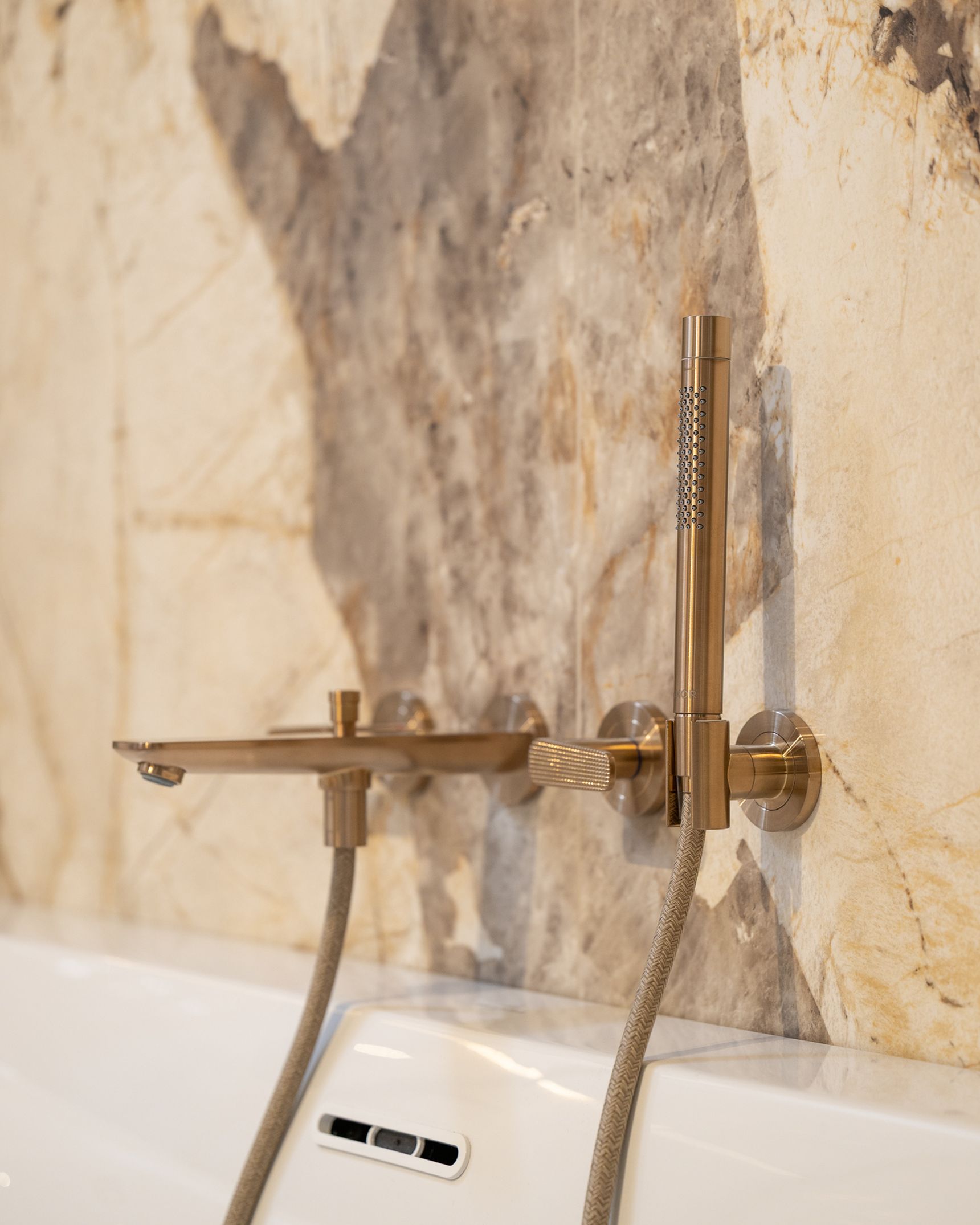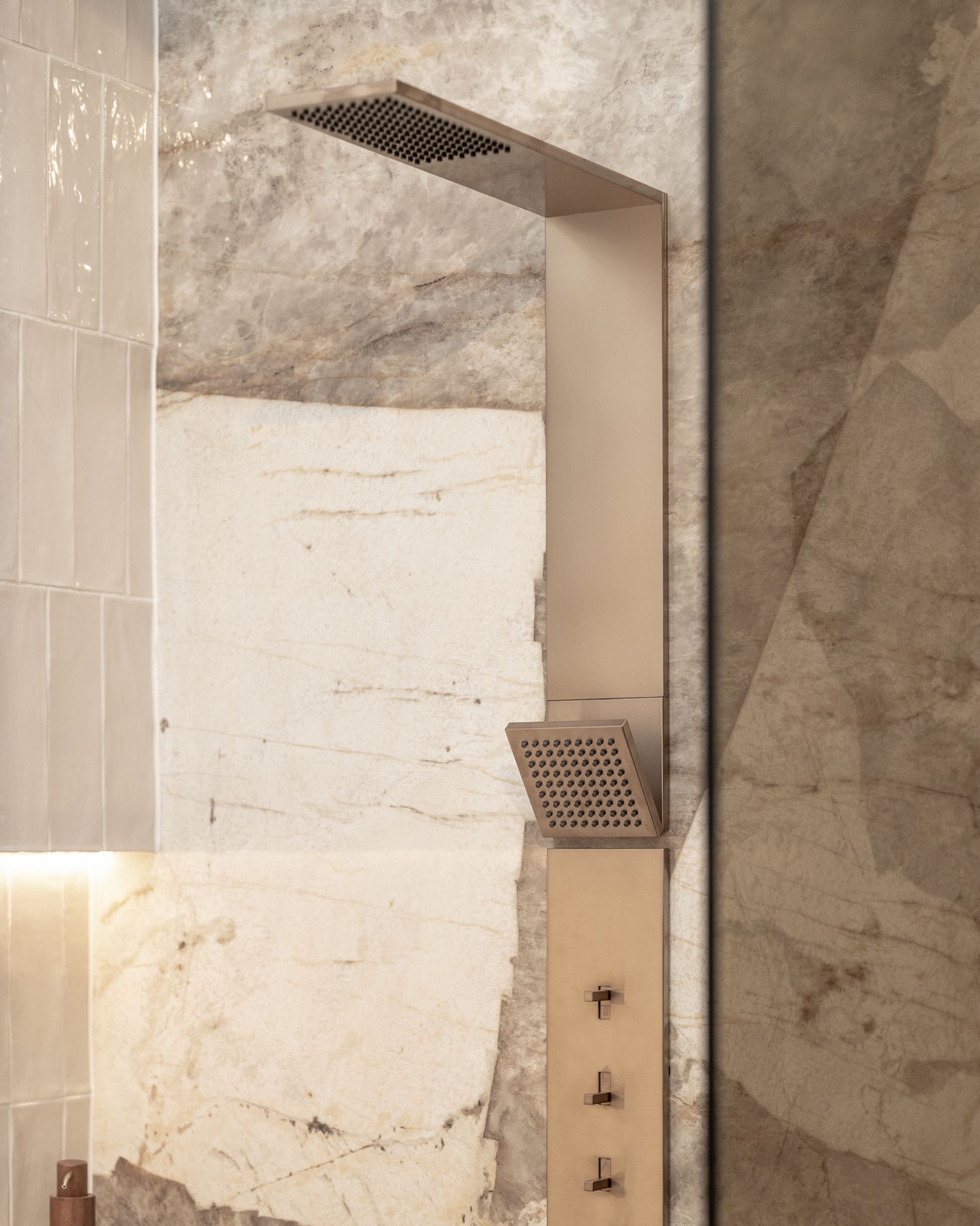 Waar de tegels voor balans zorgen, brengen de details warmte. Het kraanwerk in brushed bronze voegt een zachte, luxueuze gloed toe die perfect aansluit bij de aardse tinten van de Desert Soul tegel.
