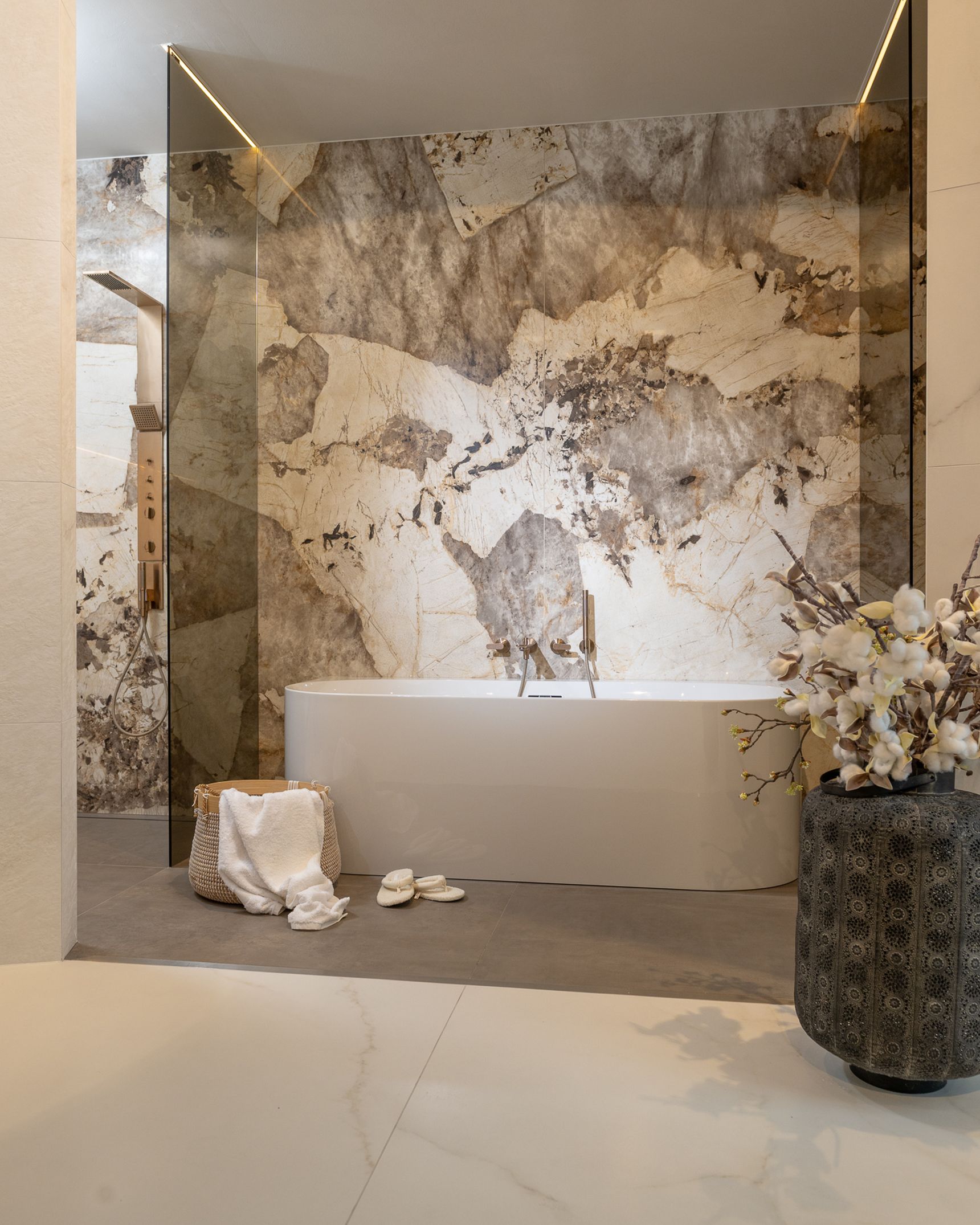 De basis begint dan ook bij deze megastone. De Desert Soul is geen standaard tegel, maar een krachtig visueel element met een verhaal. De print is geïnspireerd op één van de zeldzaamste natuurwonderen uit de Californische woestijn en brengt een gevoel van uitgestrektheid en stilte in de ruimte.