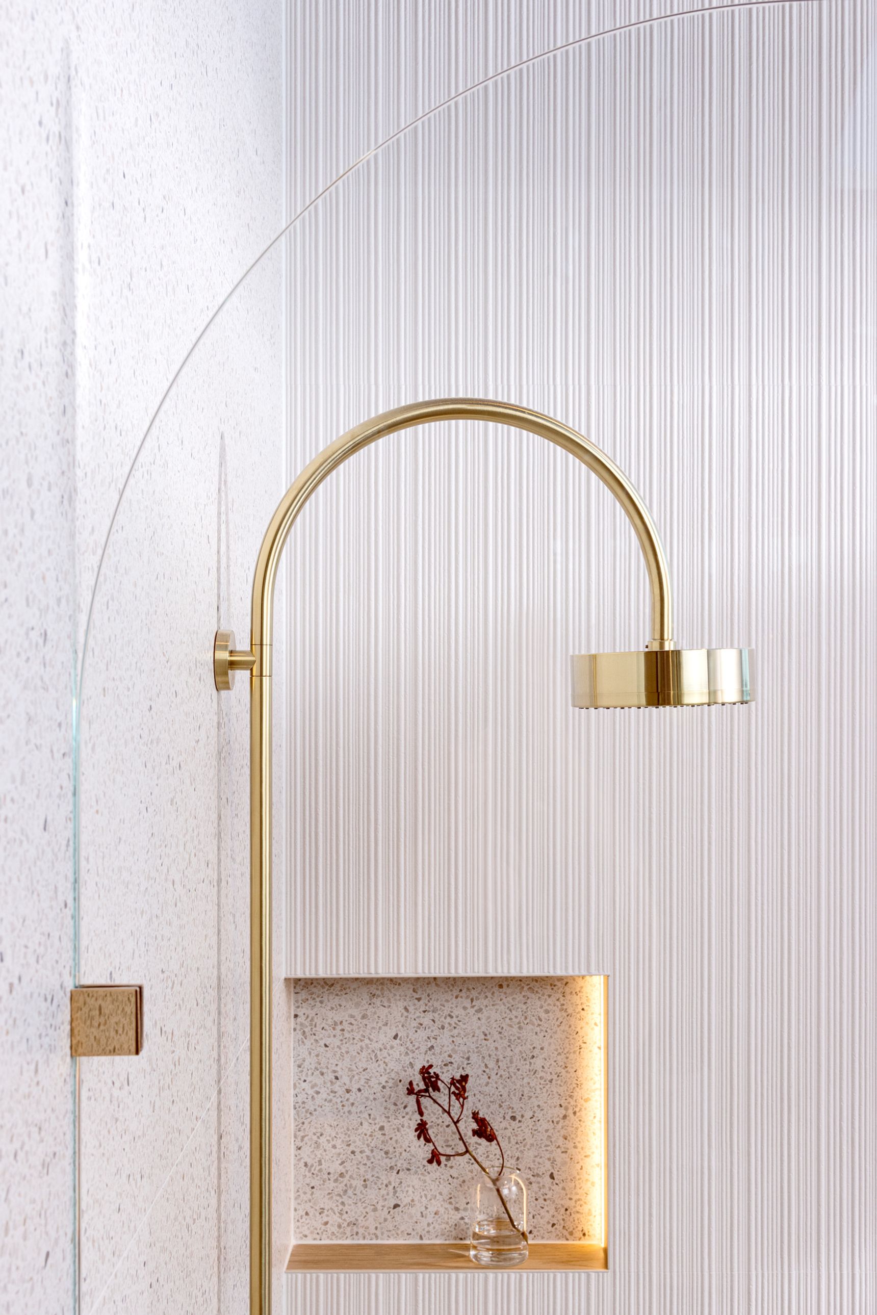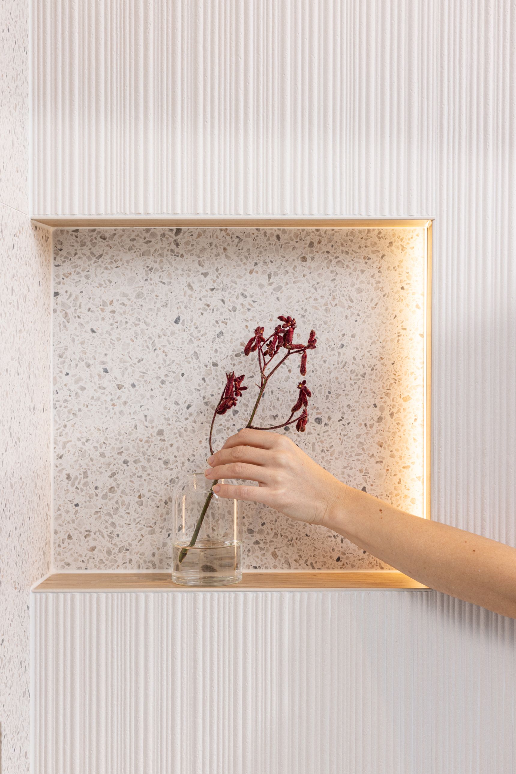 Vervolgens laat Sara een laatste detail zien: de indirecte verlichting in de nis. “Dit is echt een subtiele, maar krachtige toevoeging,” legt ze uit. “De verlichting is strategisch verticaal geplaatst en volgt de ribbels van de wand. Zo ontstaat een zachte gloed die de badkamer op een ingetogen manier verlicht. Het is precies die balans tussen design en functionaliteit waar we bij Steylaerts naar streven.”