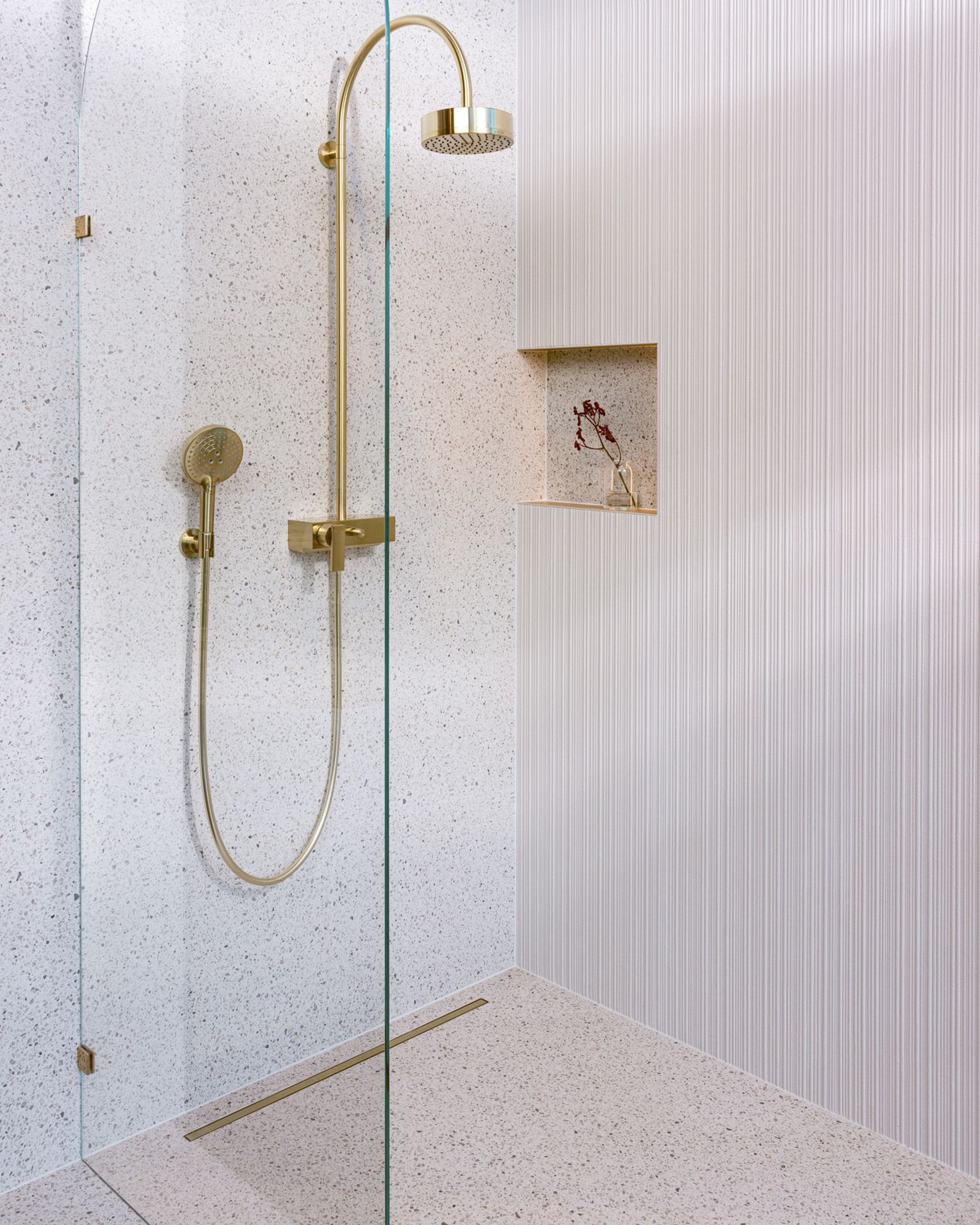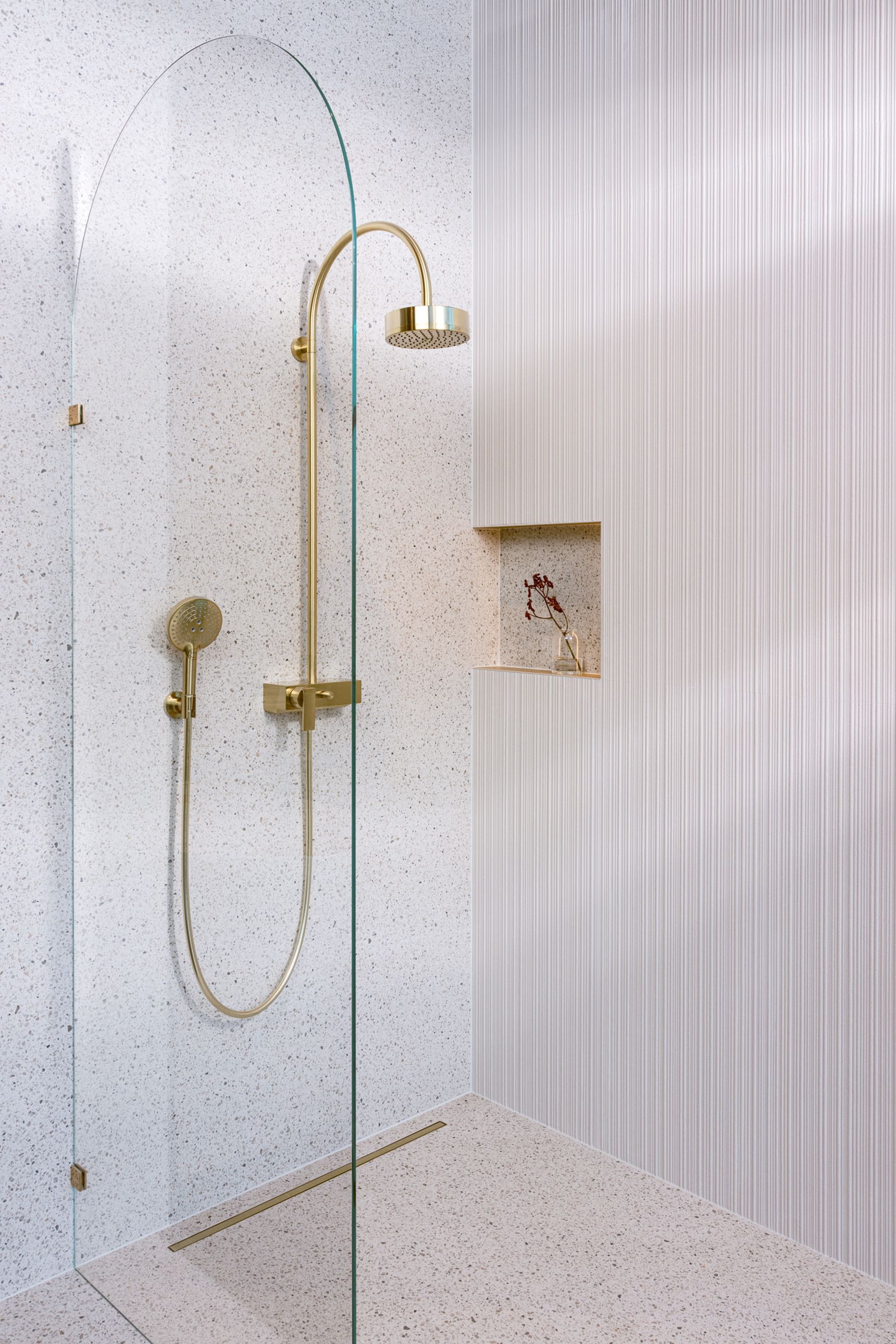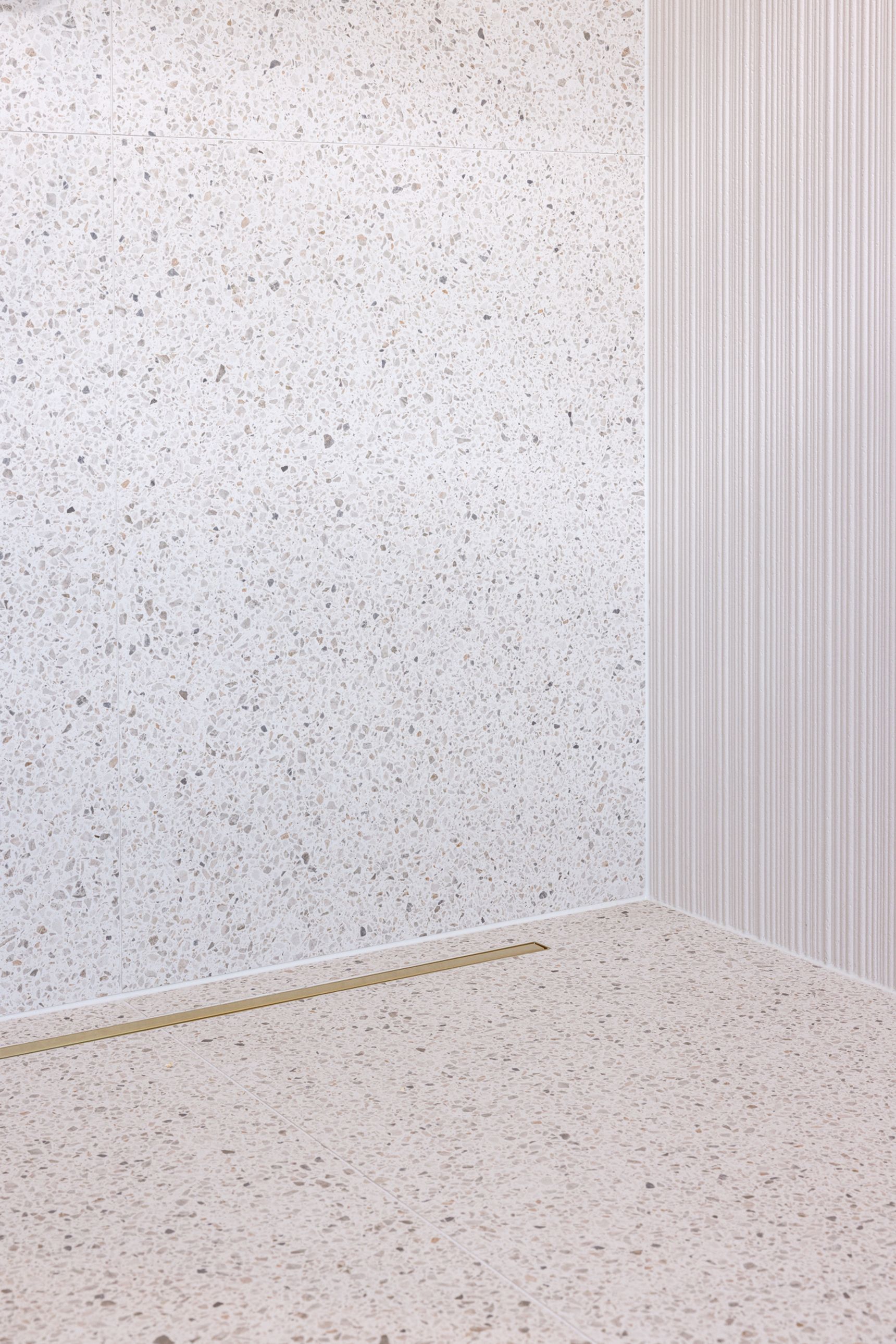Terwijl de wandeling door de ruimte verder gaat, valt het oog op het douchegedeelte. Sara wijst naar de trendy terrazzo tegel die de vloer van de douche bedekt. “Veel mensen waarderen tegenwoordig tactiele ervaringen in hun interieur,” vertelt ze. “De terrazzo tegel in combinatie met de zacht geribbelde wand biedt niet alleen een visuele, maar ook een zintuiglijke ervaring. Het voelt aan als een luxe spa, gewoon thuis.”