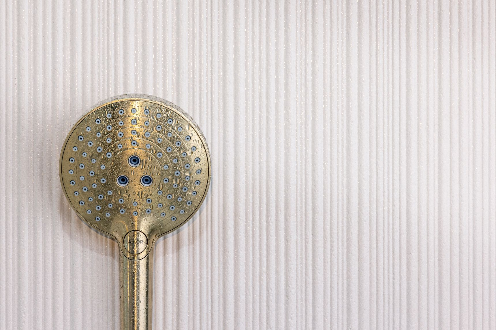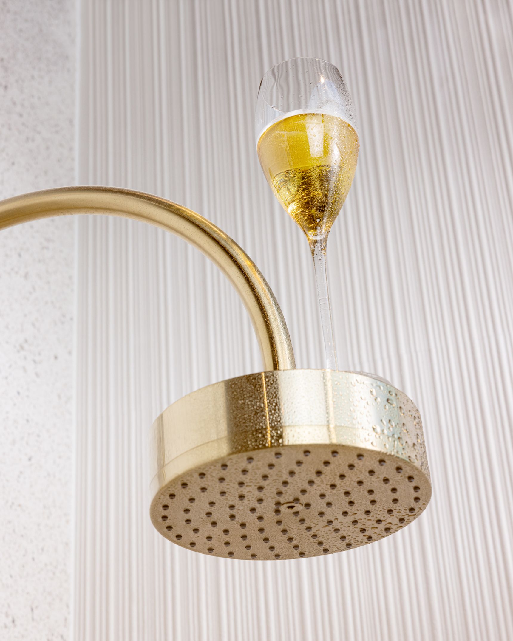Onze aandacht valt vervolgens op het champagnekleurige sanitair en de halfronde douchekraan. “Dit is misschien wel één van mijn favoriete details in deze badkamer,” geeft ze toe. “De champagnekleur straalt luxe en verfijning uit. En door het gebruik van extra helder glas in het douchescherm verdwijnt de groene rand van het glas bijna volledig. Het resultaat is een strakke, moderne uitstraling die bezoekers van onze showroom fantastisch vinden.”