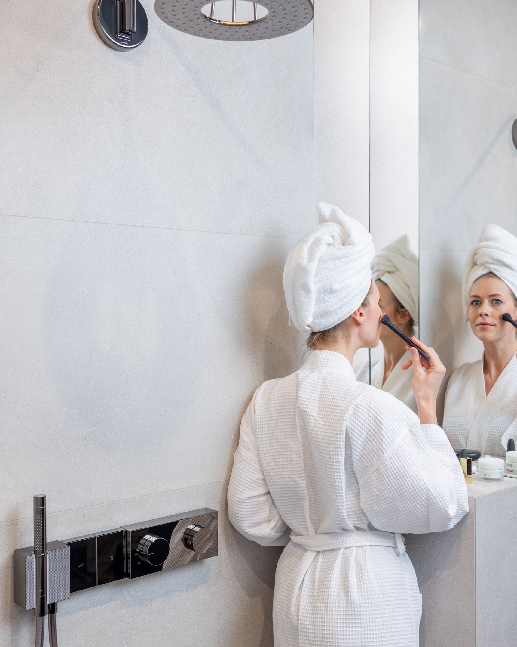 Verder helpt ook de combinatie met lichte kleuren van de Dozza White tegels en andere spiegelende oppervlakken om het benauwde gevoel te vermijden dat vaak gepaard gaat met kleinere badkamers.