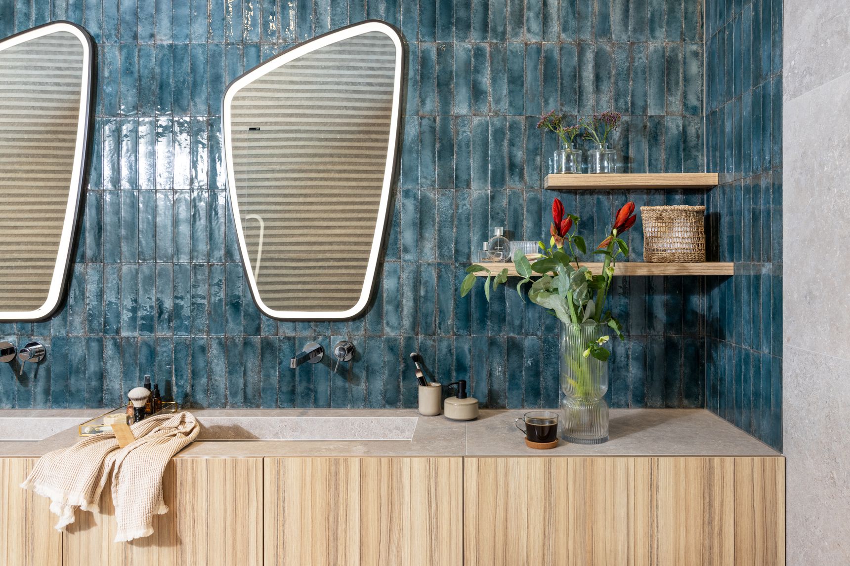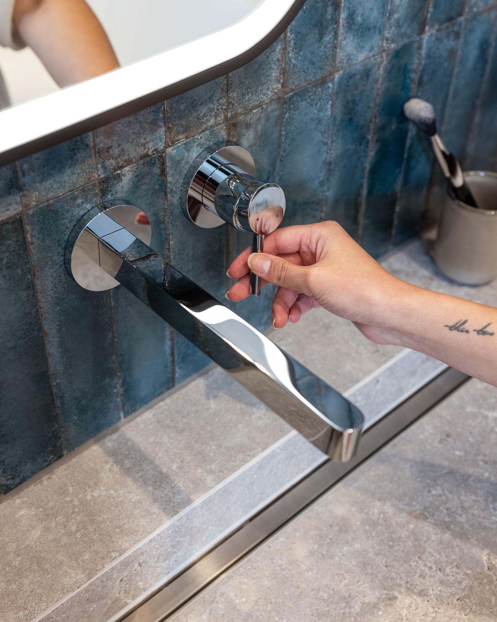 De lavabo's zijn betegeld met dezelfde verfijnde tegels en voorzien van het unieke Carrodrain douchegoot design. Sara vertelt hierover: "Het gebruik van Carrodrain zorgt ervoor dat zelfs functionele elementen zoals lavabo’s en douchegoten bijdragen aan het esthetische geheel."
