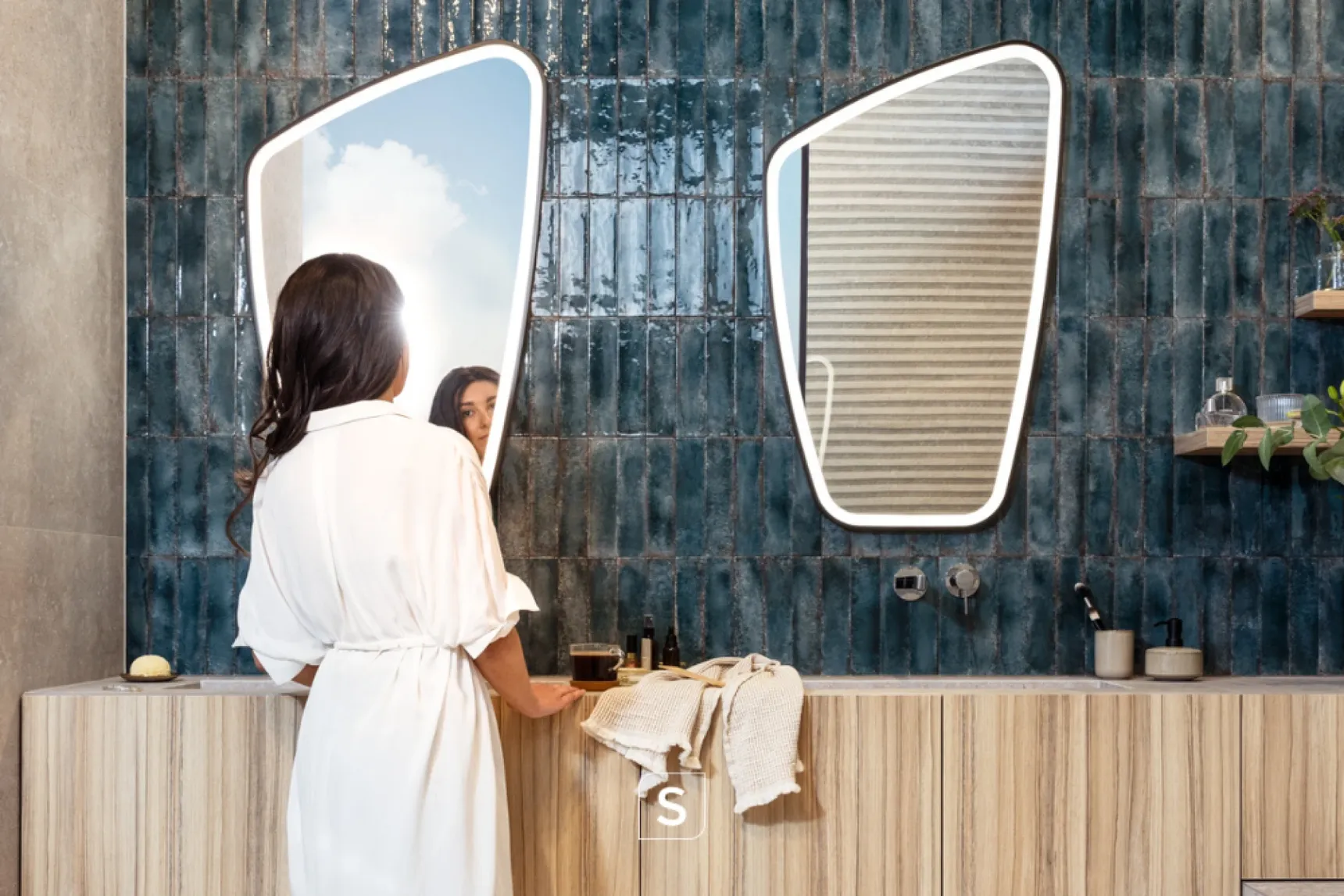 De spiegels zorgen met hun speelse vormen voor een dynamische uitstraling. Daarnaast werd er een op maat gemaakt douchescherm geplaatst met een stijlvolle uitsparing voor het bad. Sara zegt hierover: "Dit maatwerk zorgt ervoor dat elk onderdeel van de badkamer naadloos in elkaar overloopt en een mooi afgewerkt geheel vormt."