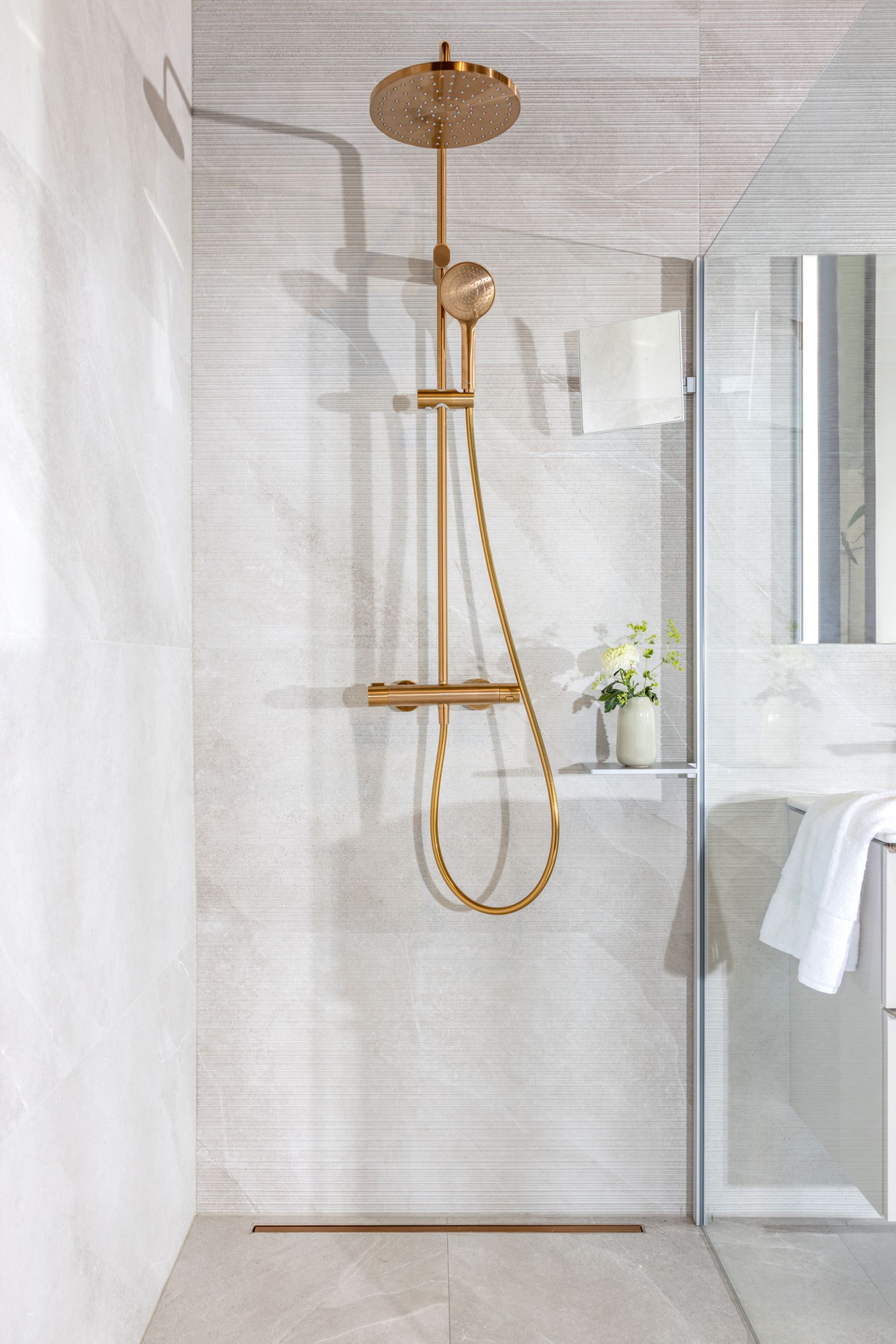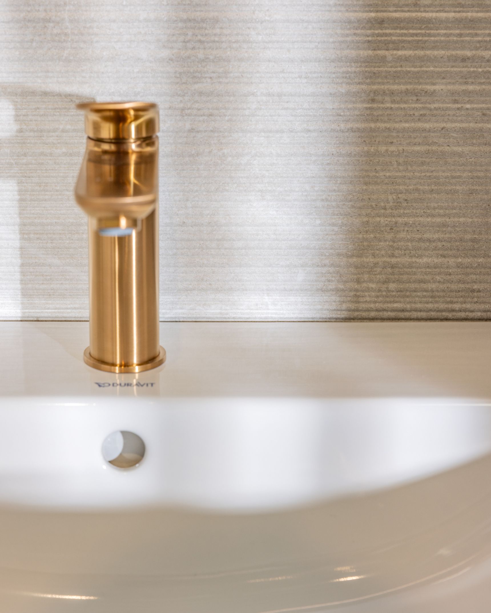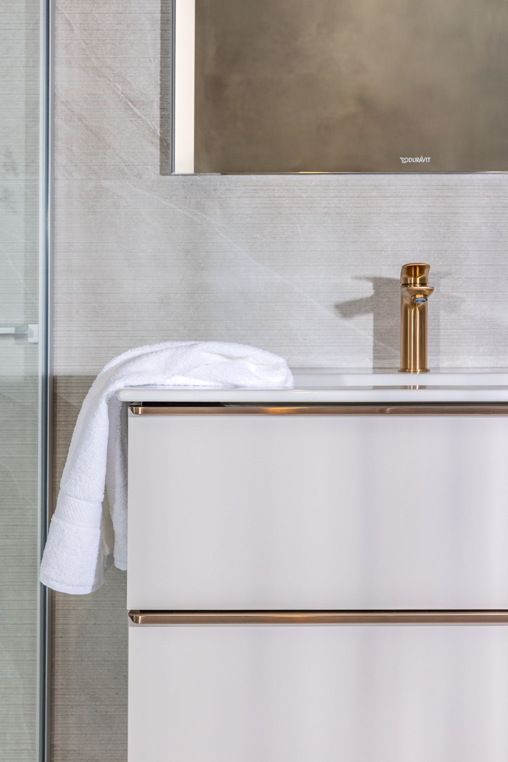 Wanneer vorm en materiaal in balans zijn, maken de afwerkingen het verschil. Het kraanwerk in de Pacific Moon badkamer is uitgevoerd in brushed bronze, zowel aan het meubel als in de douche. Deze warme metaaltoets vormt een elegant contrast met de zachte natuursteenlook van de Pacific Moon tegel.