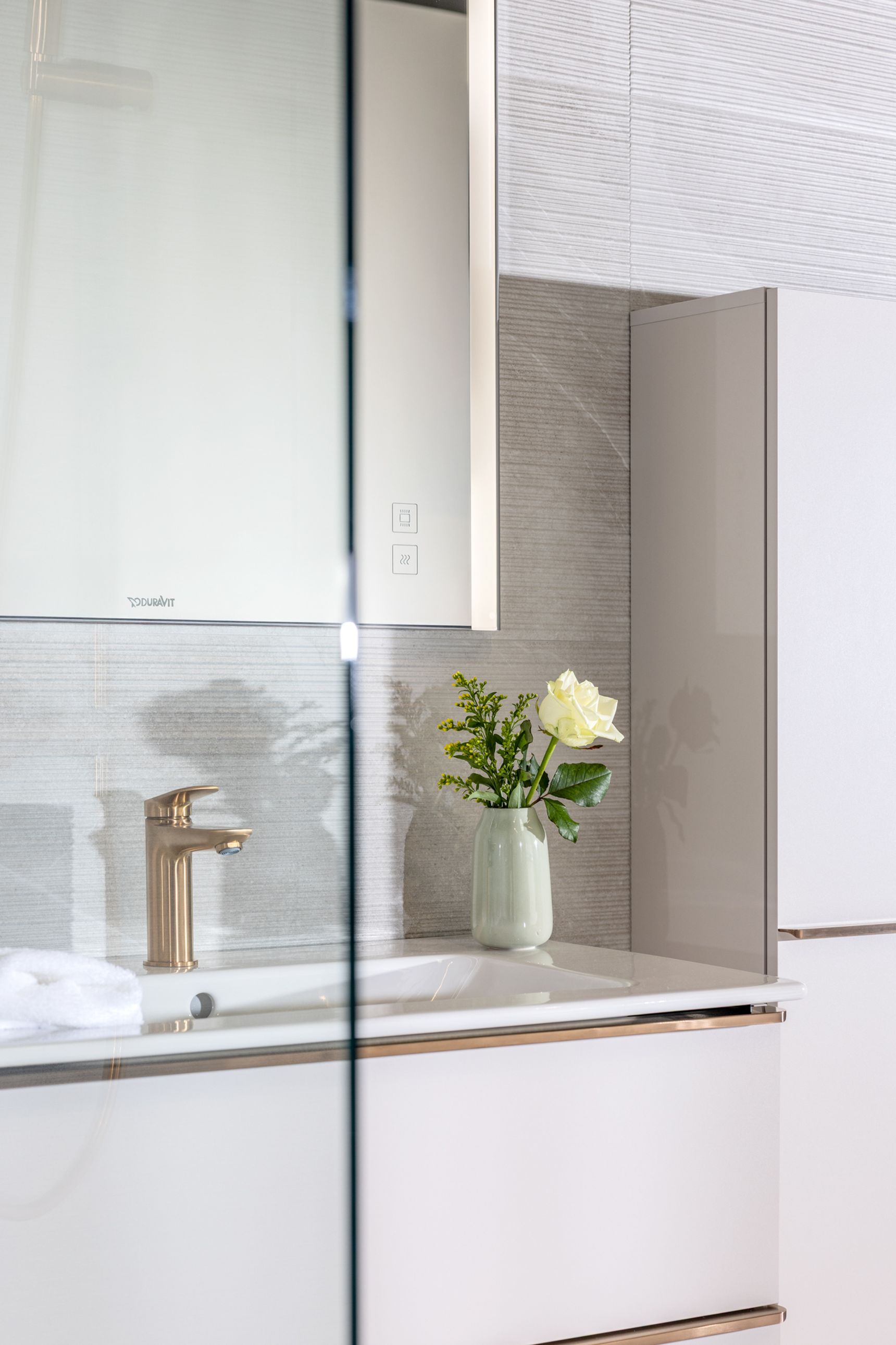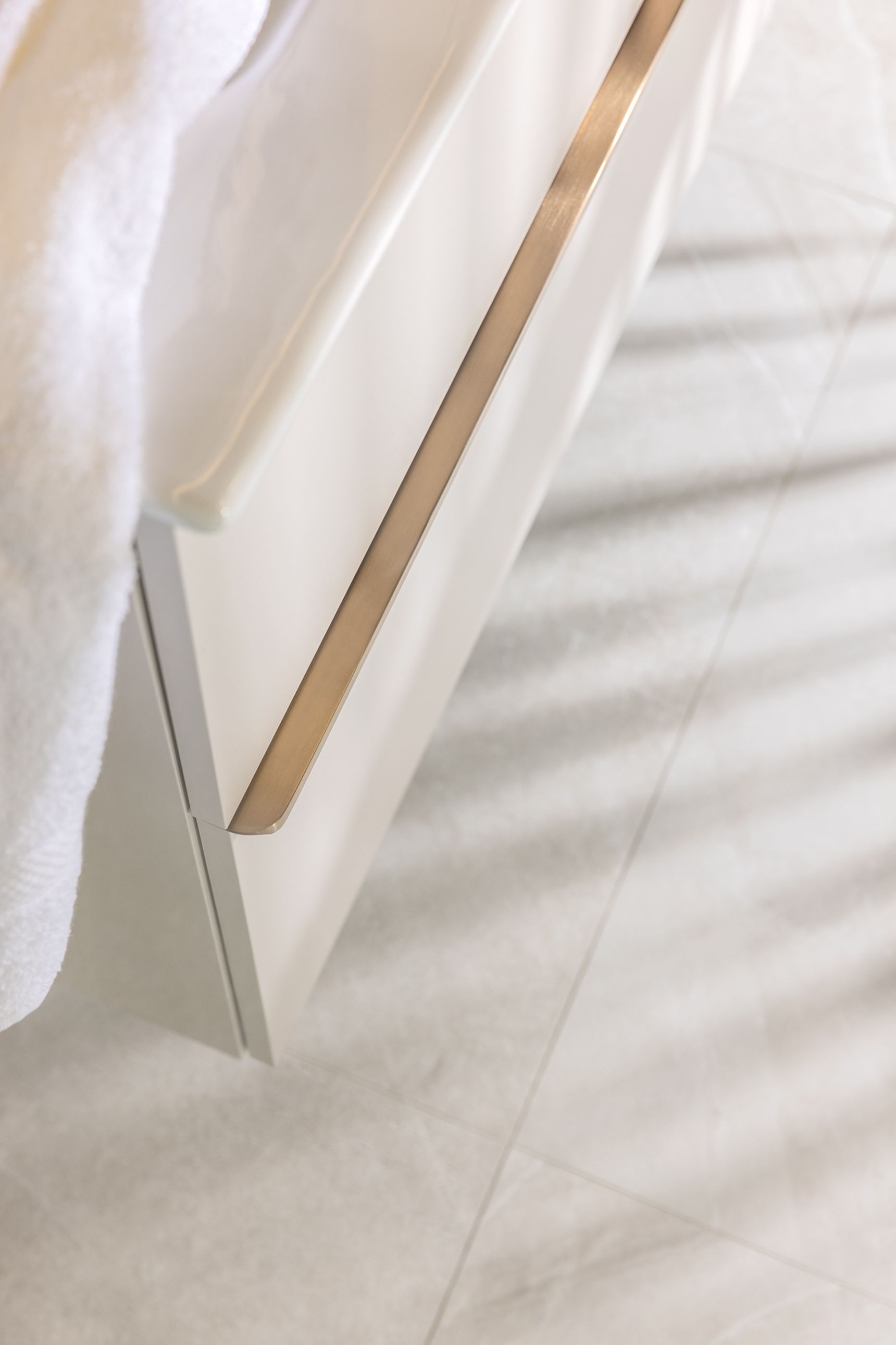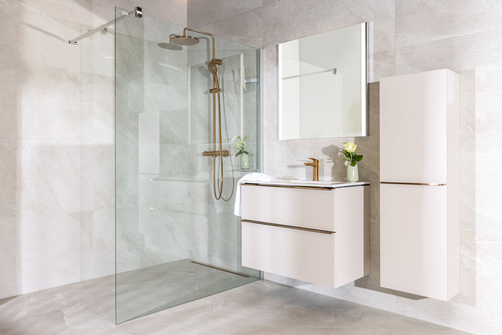 Wanneer vorm en materiaal in balans zijn, maken de afwerkingen het verschil. Het kraanwerk in de Pacific Moon badkamer is uitgevoerd in brushed bronze, zowel aan het meubel als in de douche. Deze warme metaaltoets vormt een elegant contrast met de zachte natuursteenlook van de Pacific Moon tegel.