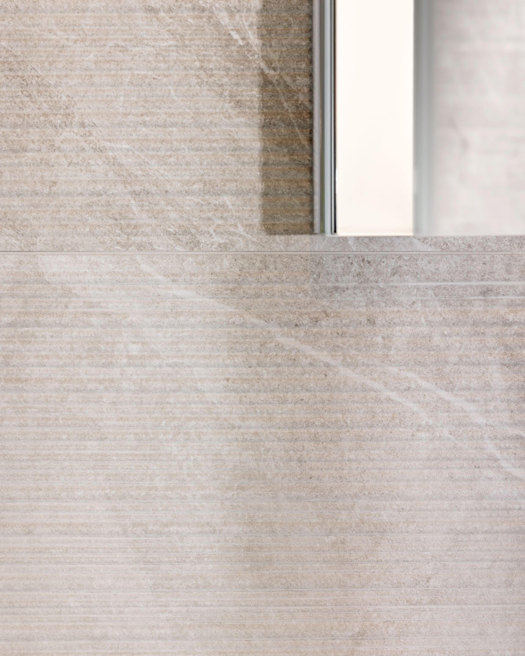 Achter het meubel en in de douche wordt dit effect verder doorgetrokken met de Pacific Moon ribbed decortegel. De horizontale lijnen van deze decortegel accentueren de breedte van de ruimte en versterken het open, ontspannen gevoel dat in de hele badkamer aanwezig is.
