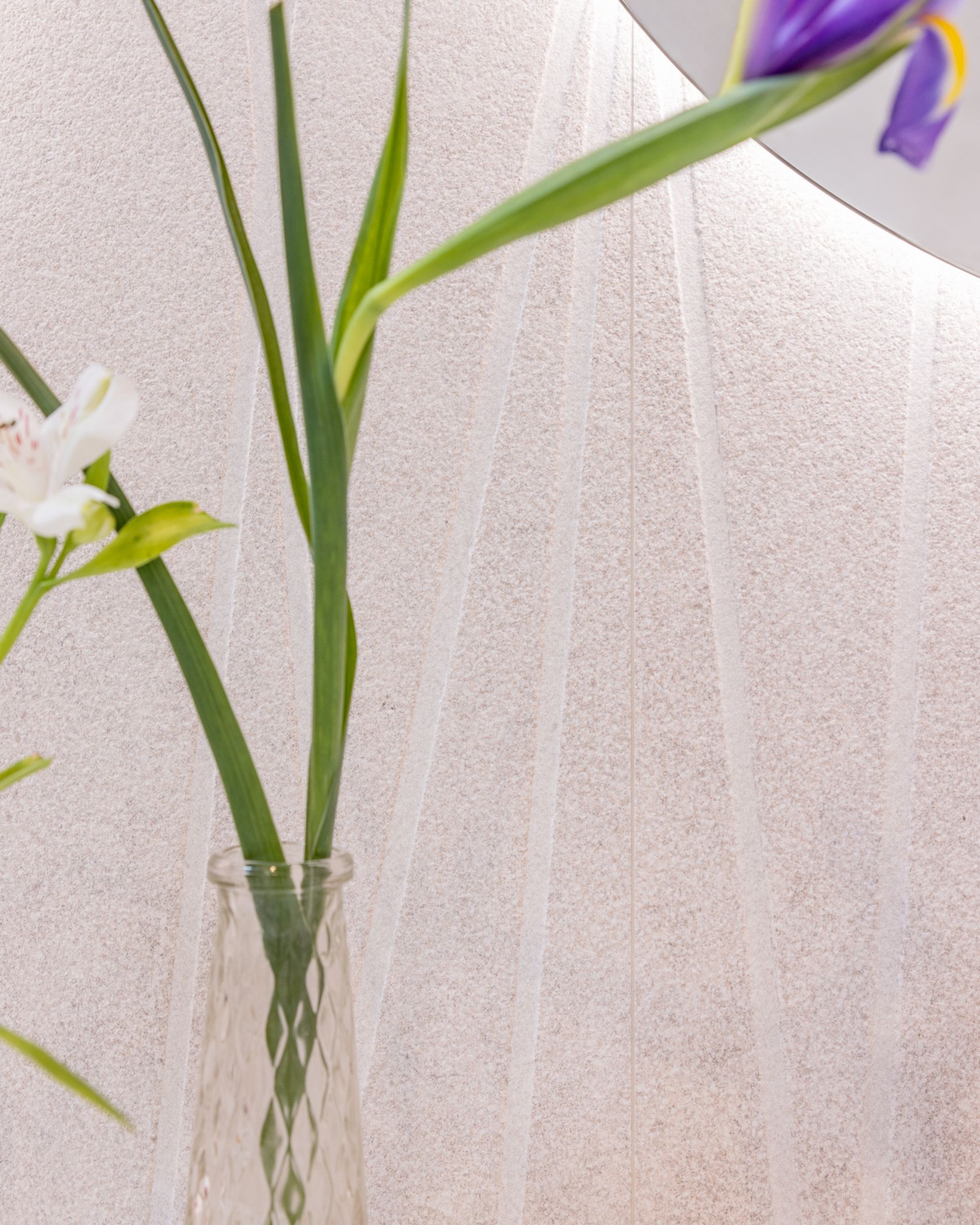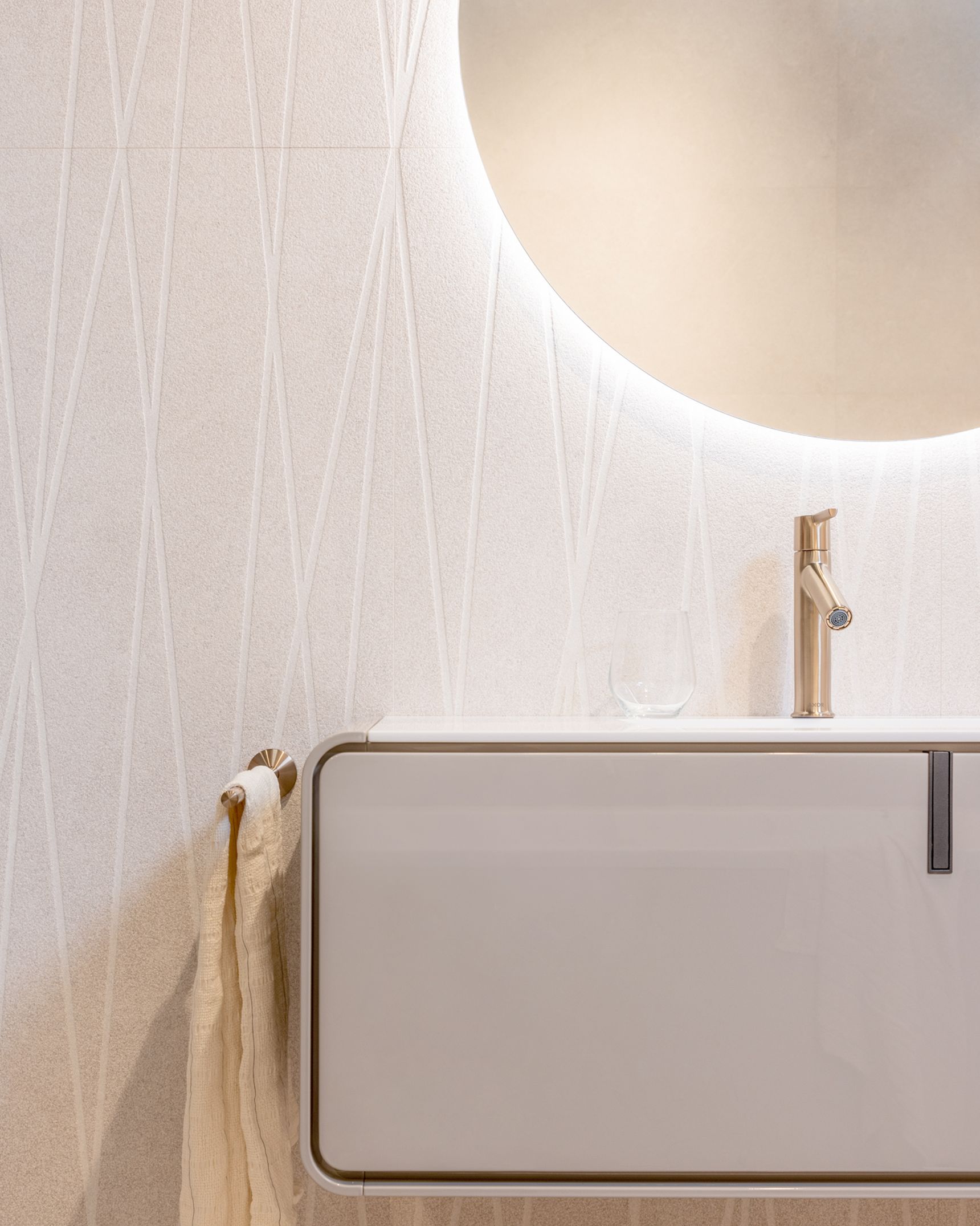 Vanuit die rustige basis spelen de lichte wandtegels een belangrijke rol. Ze houden de muren helder en open, waardoor de ruimte onmiddellijk groter oogt. De verticale decortegel achter het meubel sluit daar mooi bij aan: de subtiele lijnen trekken de hoogte open zonder de aandacht op te eisen. Zo ontstaat een wandvlak dat structuur geeft en tegelijk de overgang naar warmere materialen versterkt.