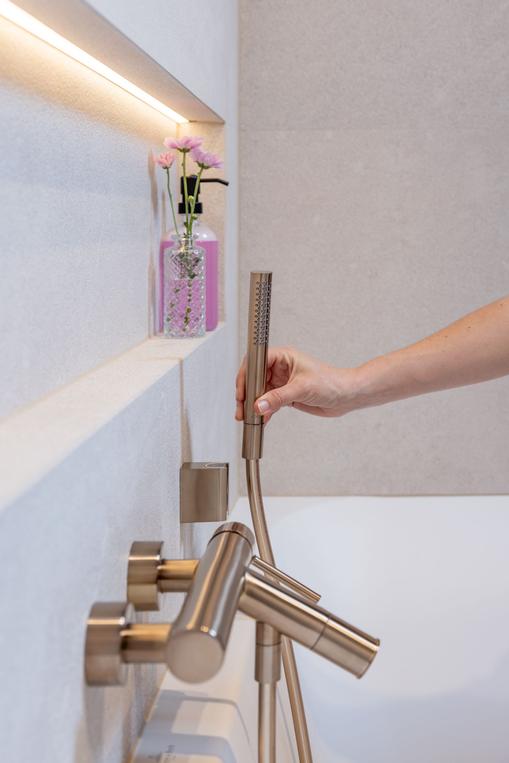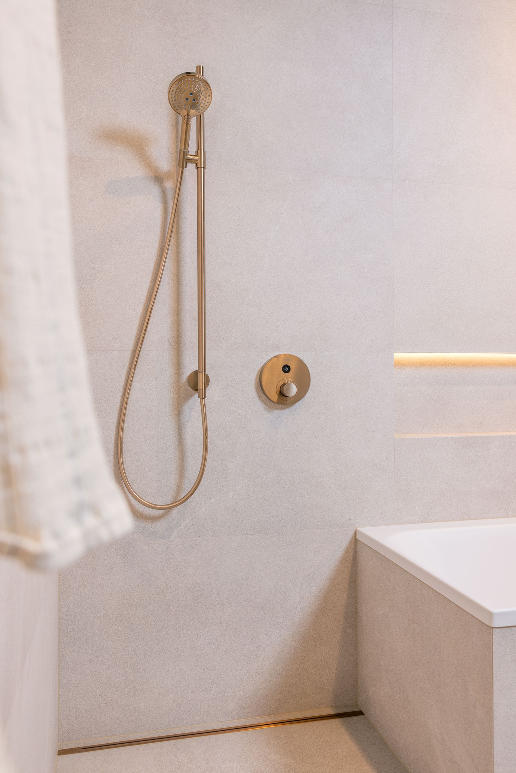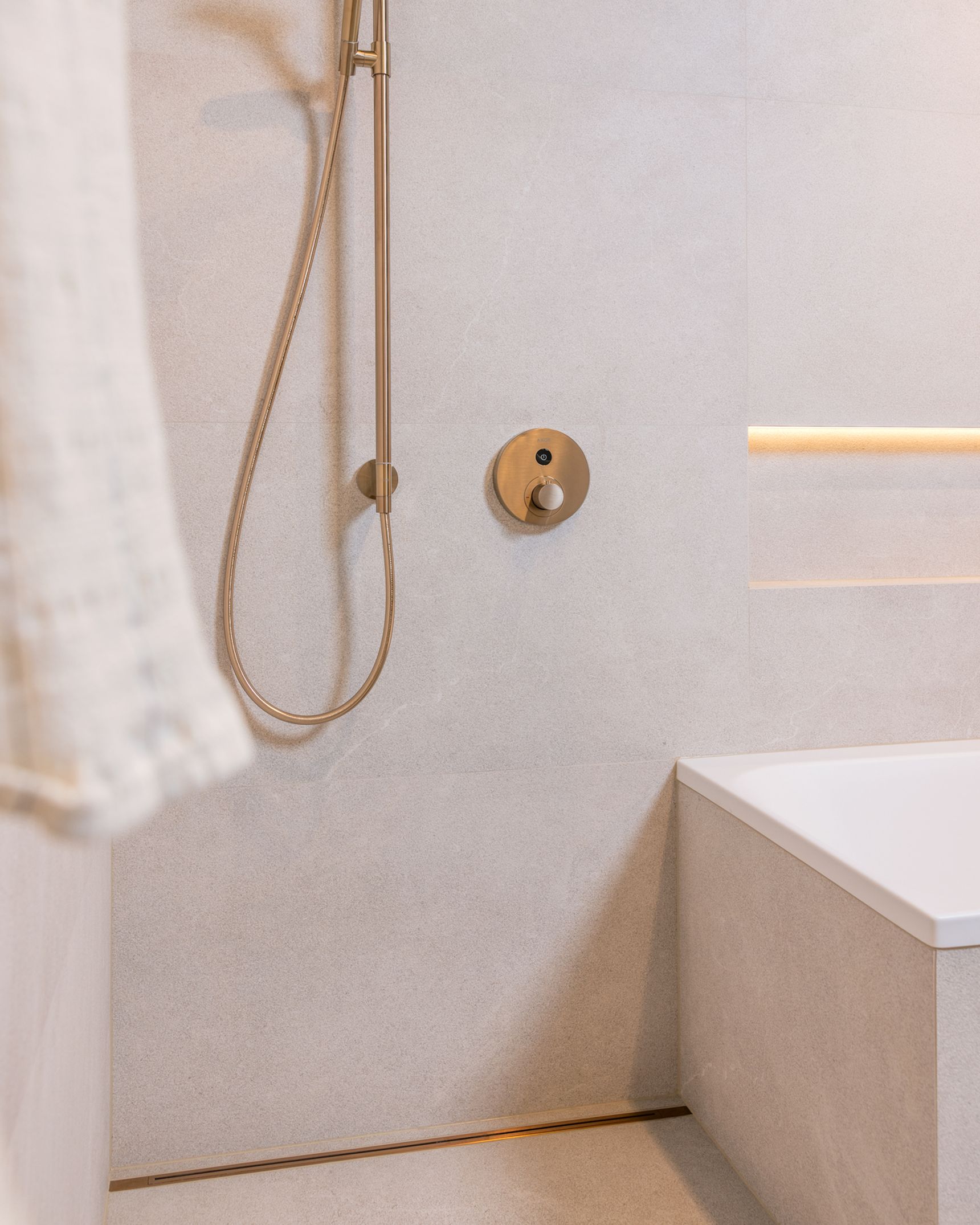 Die badzone sluit naadloos aan op de rest van de ruimte dankzij het inbouwbad met betegelde omranding. Door dezelfde materialen door te trekken blijft het geheel helder en consistent. De brushed bronze accenten voegen hier een subtiel technisch detail aan toe dat opvalt zonder luid te zijn. Zo ontstaat een badkamer waarin elke keuze logisch voortkomt uit de vorige, van wand tot vloer en van meubel tot kraanwerk.