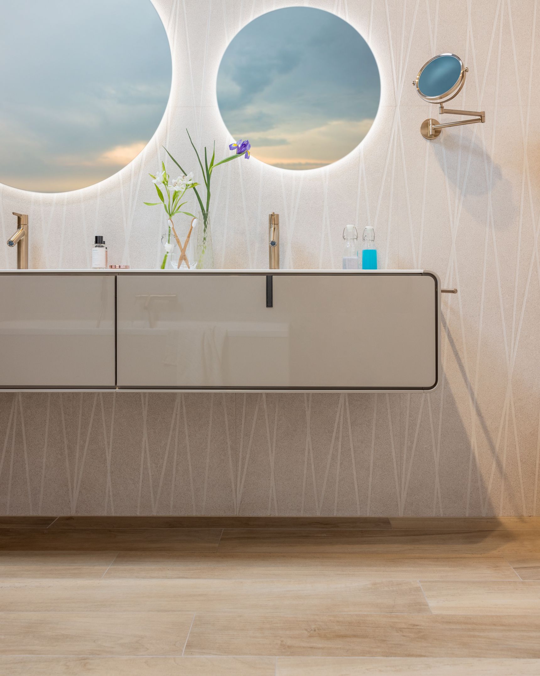 Op dat warme fundament komt het afgeronde badkamermeubel volledig tot zijn recht. De zachte lijnen sluiten aan bij de natuurlijke uitstraling van de vloer en voorkomen dat de compacte kamer te hoekig wordt. De twee ronde spiegels met indirect licht versterken dat effect: het licht spreidt zich rustig uit over de wanden en maakt de overgang naar de badzone nog vloeiender.