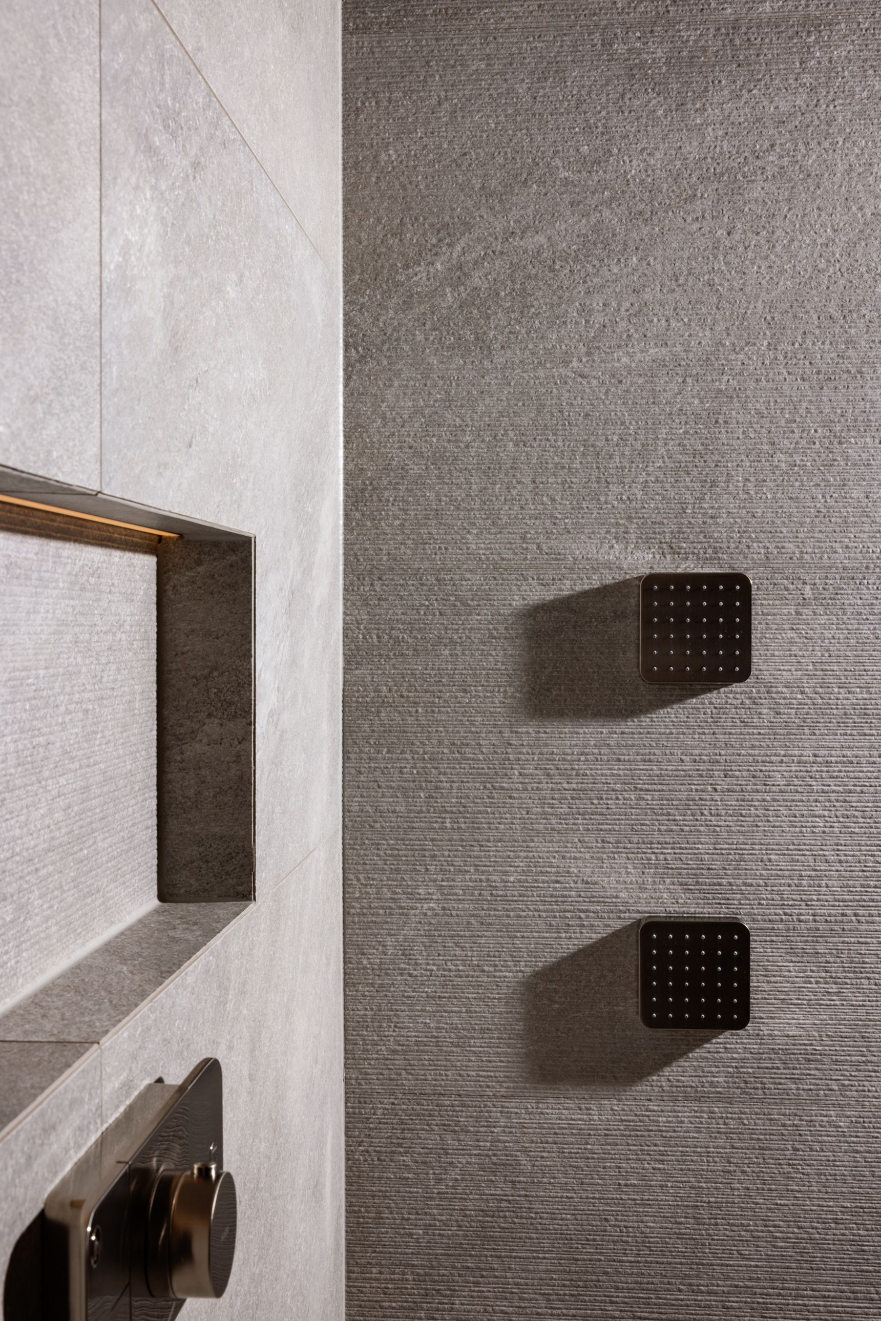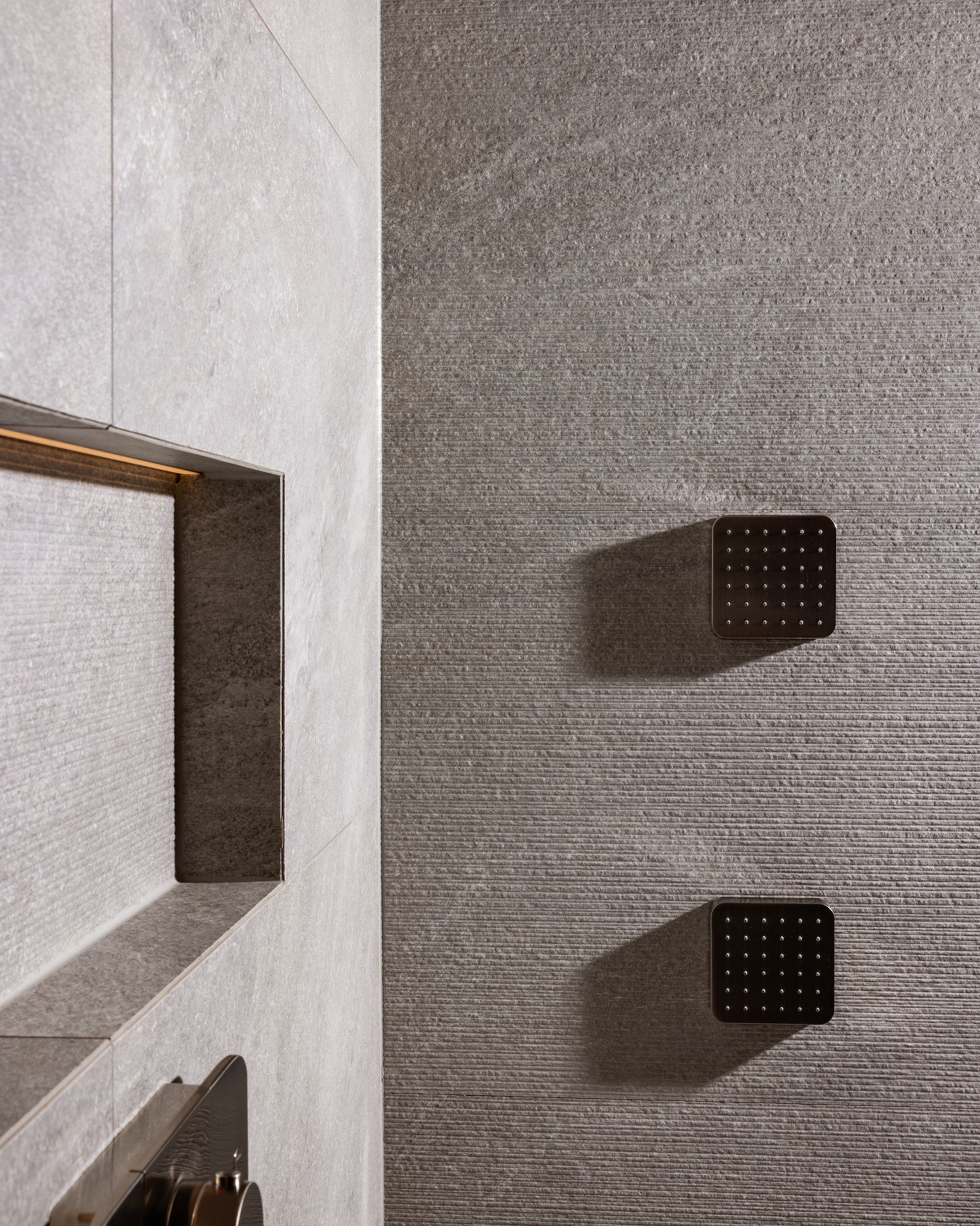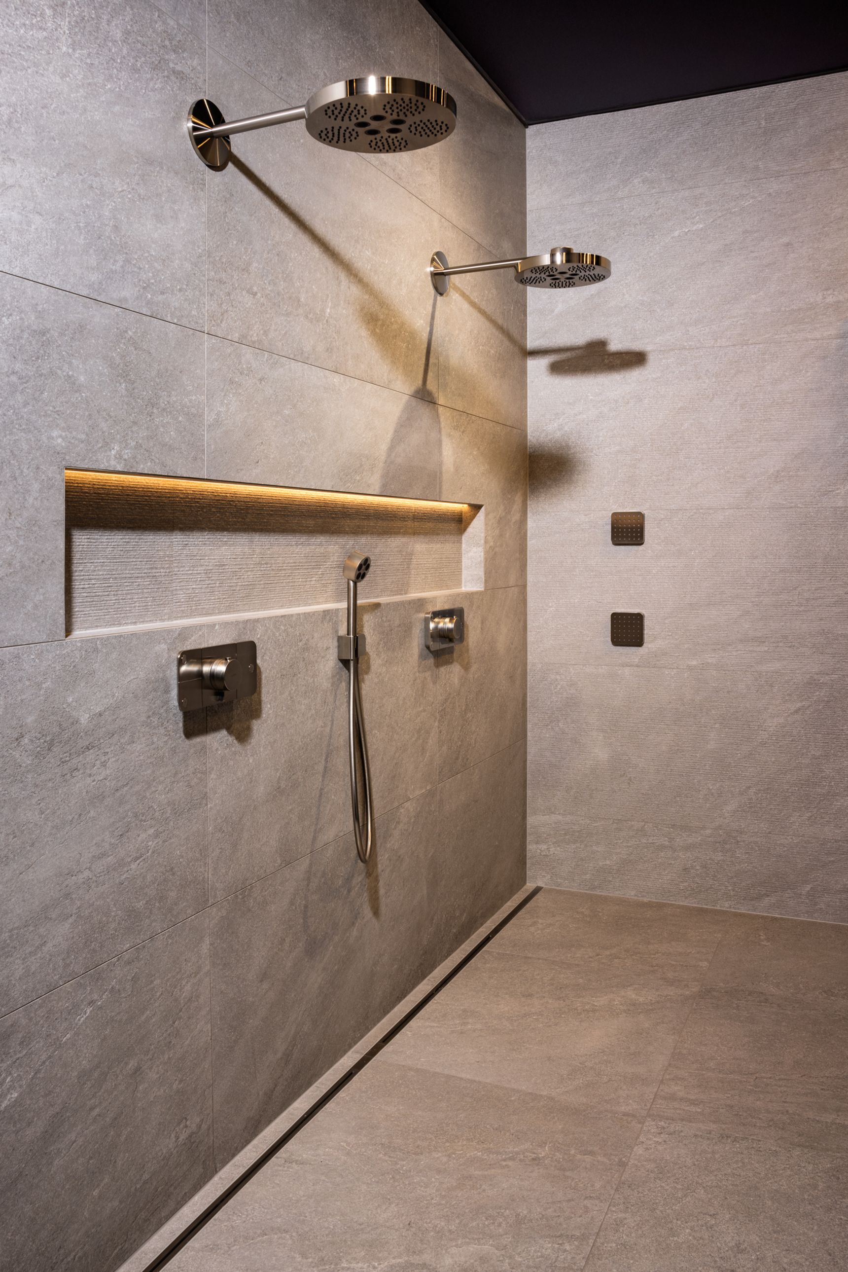 Sara wijst naar de twee hoofddouches die de blikvangers van de ruimte zijn. "Met deze dubbele hoofddouches kunt u samen genieten van een ontspannen moment, zonder in te boeten aan comfort. Met de twee aparte thermostaten kiest u elk uw eigen temperatuur en waterstraal. Dat maakt douchen net dat tikkeltje specialer."