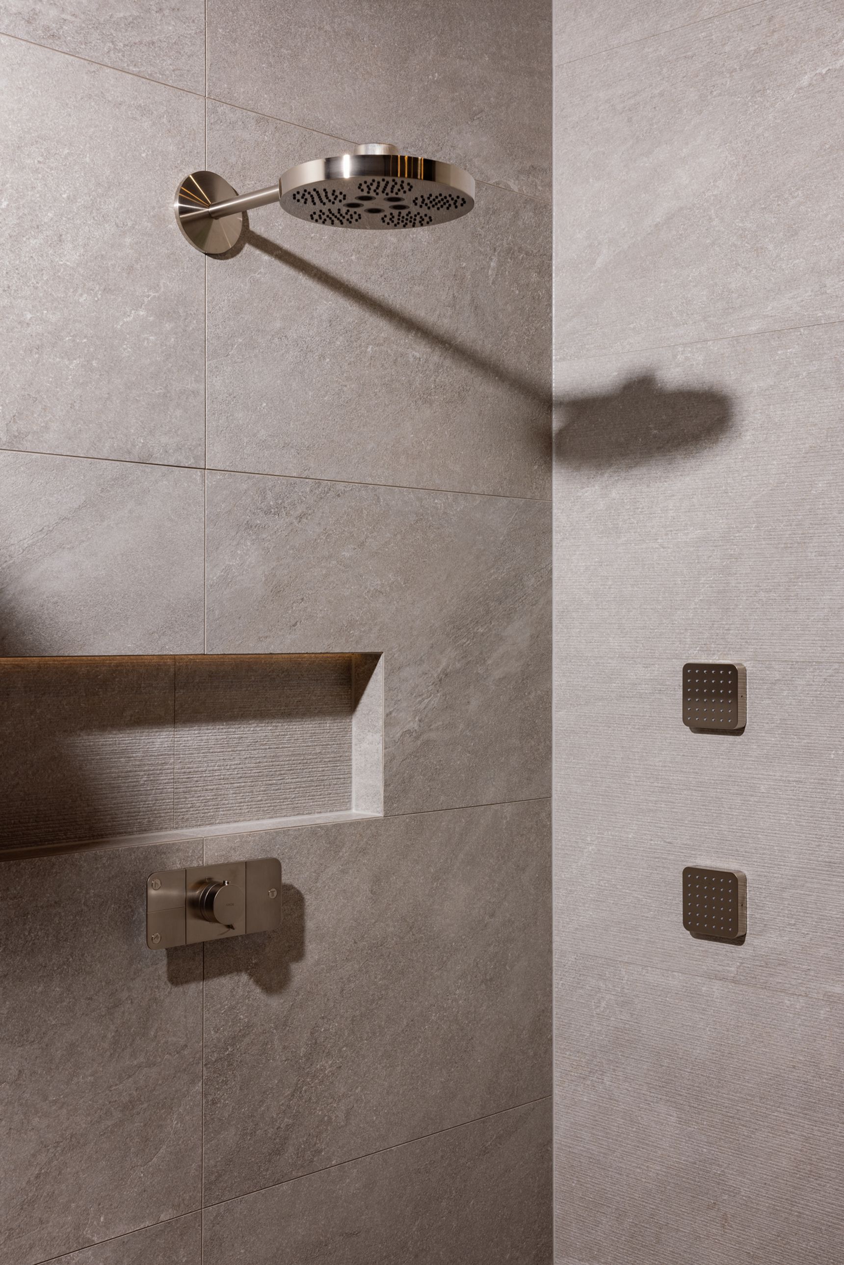Het inbouwkraanwerk in geborsteld RVS helpt daar ook bij. "Het strakke design en de luxe uitstraling van dit kraanwerk maken deze douche helemaal af," zegt Sara. "Omdat alles is ingebouwd, blijft de ruimte luchtig en overzichtelijk. Dit alles samen met de douchegoot die over de volledige breedte van de douche loopt, zorgt dit voor een minimalistische look met maximaal comfort."