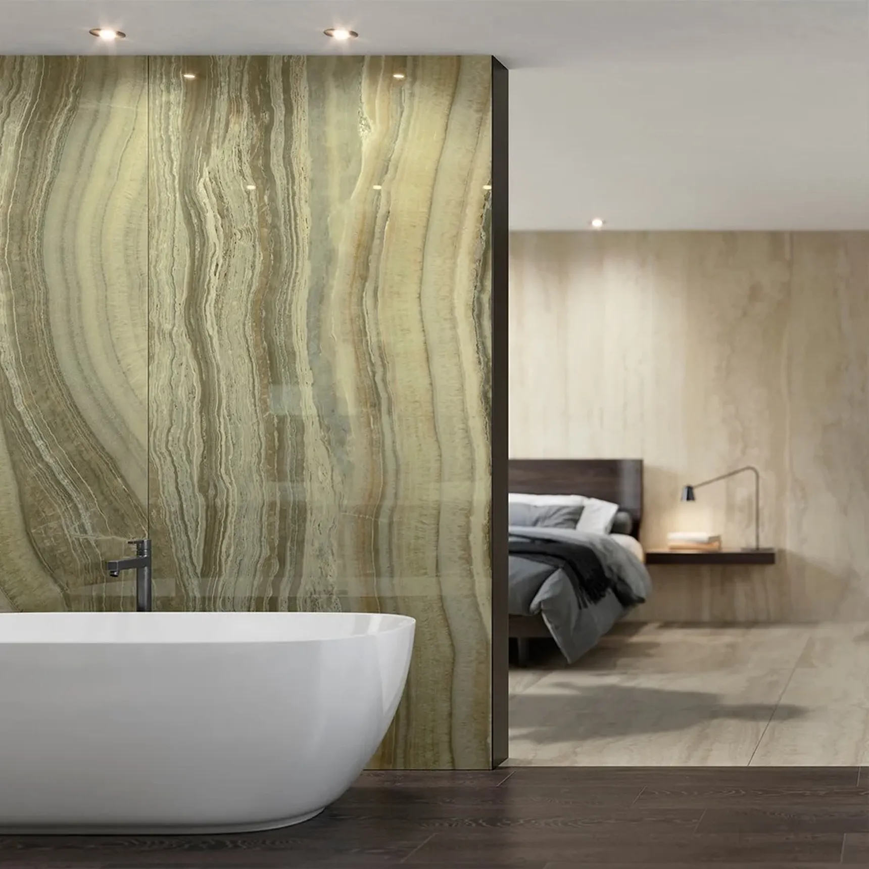 Het enorme formaat van deze supergrote en zeer dunne keramische tegel maakt elke kamer ruimer. De afwezigheid van voegen zorgt voor extra rust én makkelijker onderhoud. Prachtig stijlvol in uw badkamer, aan uw gevel of in het zwembad.