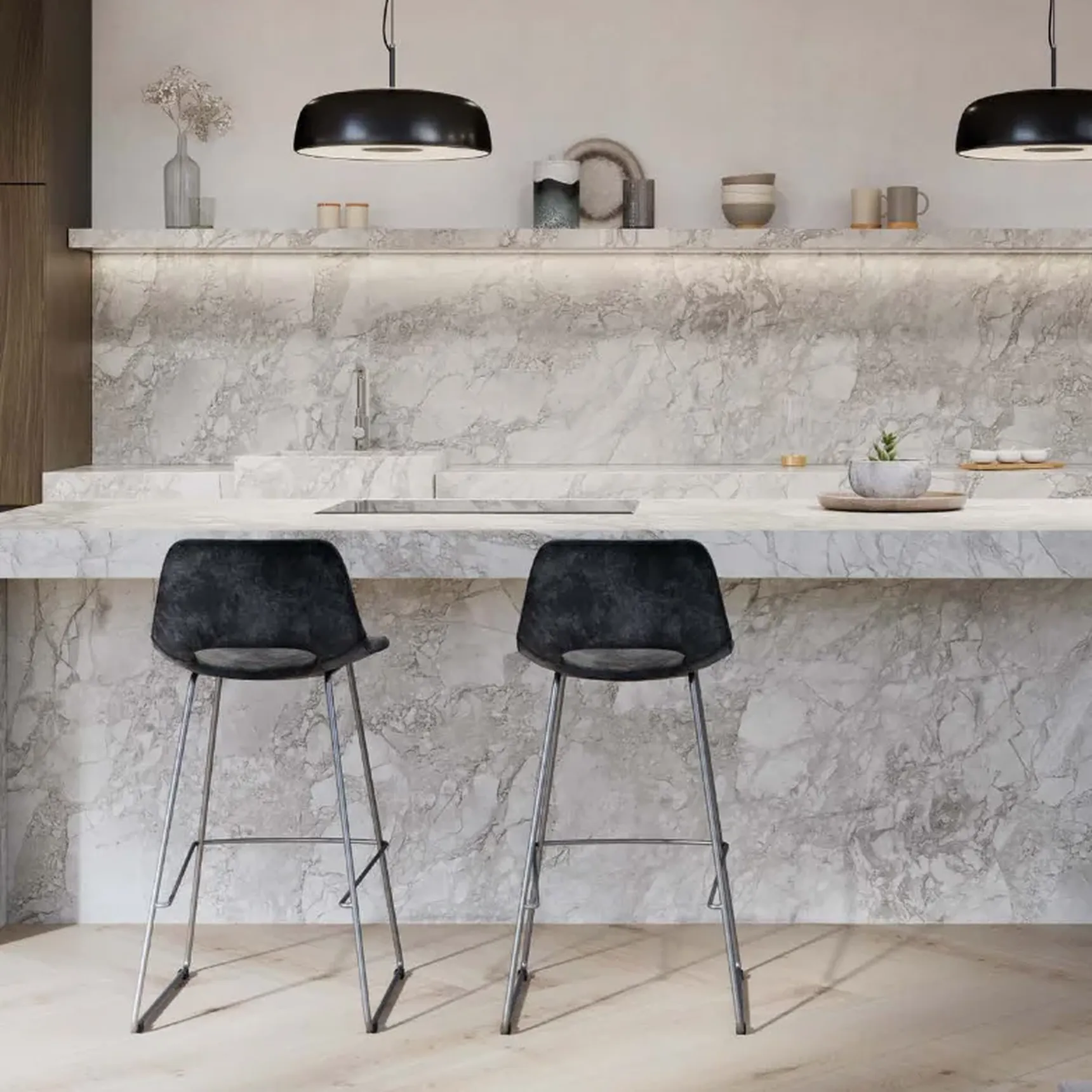 XXL-tegels, mega stones of grootformaattegels zijn tegels van 120 x 120 cm of zelfs nog groter, tot 120 x 280 cm. Ze geven meteen een gevoel van high-end design, vooral in marmerlook, betonlook of natuursteenimitatie. Bovendien creëren ze een visueel kalm geheel, met nauwelijks onderbrekingen. Ideaal voor wie houdt van strak en tijdloos, of in een kleine ruimte. Mooi meegenomen: minder voegen betekent ook minder plaatsen waar kalk of vuil zich kan ophopen, dat maakt ze zowel praktisch als hygiënisch.